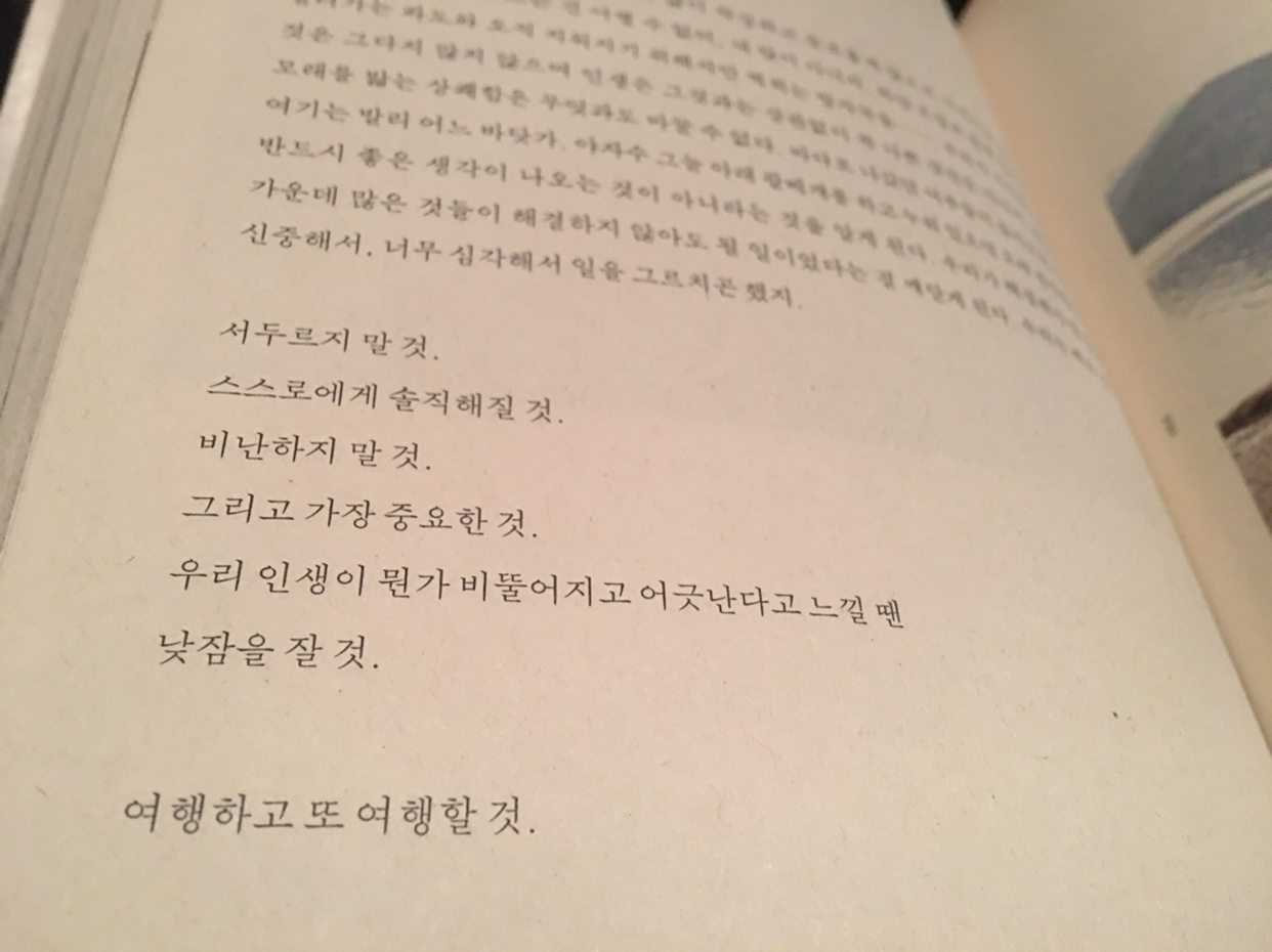 책 속에서 발견한 이 간결한 문장으로 나는 충분히 고독해야 하는 이유를 찾았다. 홀로됨으로써 느끼는 고독의 즐거움과 더 나아가서는 곁에 있는 누군가에 대한 소중함을 위해 마음이 동하는 때면 나는 가방을 둘러 메고 훌쩍 떠나곤 한다. 혼자인 시간을 즐길 수 있는 사람이 함께인 시간을 잘 보낼 수 있다는 것을 믿기 때문에. 그리운 누군가의 체온을 떠올리며 잠이 든다. 홀로 떠난 여행에서는 언제나 사람이 그립다. 그 애뜻한 그리움이 다시금 당신과 나의 사이를 견고하게 만들어 주리라는 것을 믿기에 아마 나는 늦지 않게 또 다시 홀로 여행을 떠날지도 모르겠다. 겨울의 협재는 어떤 모습일지를 상상하며 말이다.