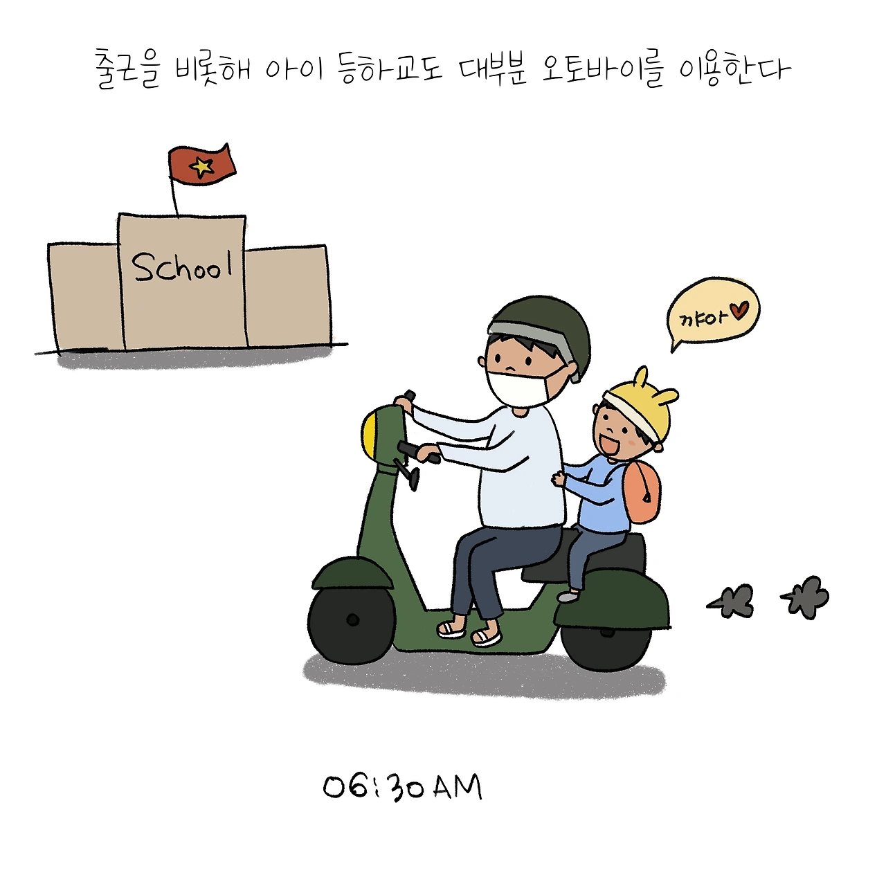한 달간 살아본 베트남에 대한 인상은 ‘오토바이의 나라’! 물론 태국에서도 오토바이가 매우 인상적이었지만 베트남 역시도 그런 것 같습니다. 한 달 넘게 이곳에서 살아가고 있지만 여전히 어딘가를 갈 때마다 창문 밖의 엄청난 오토바이 부대와 다양한 물건들을 실어 나르는 모습들은 놀랍기만 합니다. 오토바이에 실을 수 있는 것들이 이렇게나 다양할 수 있다니요. (책장, 나무, 커다란 화분, 화환, 철근 구조물…. 그 외 상상할 수 있는 대부분의 것들) 거기다 오토바이 한 대에 네 가족이 올망졸망 타고 가는 모습이라던지, 샛별이보다 더 어린 아기가 아기띠 하나 하지 않고 오토바이를 타고 가는 모습은 정말 정말 정말 놀랍습니다. 여전히 어딘가를 가기 위해 짝꿍과 창 밖을 볼 때마다 ‘우와’를 연발하는 바람에 샛별이는 요즘 “우와~”를 배워서 저와 함께 매일을 감탄하는 중이랍니다.
