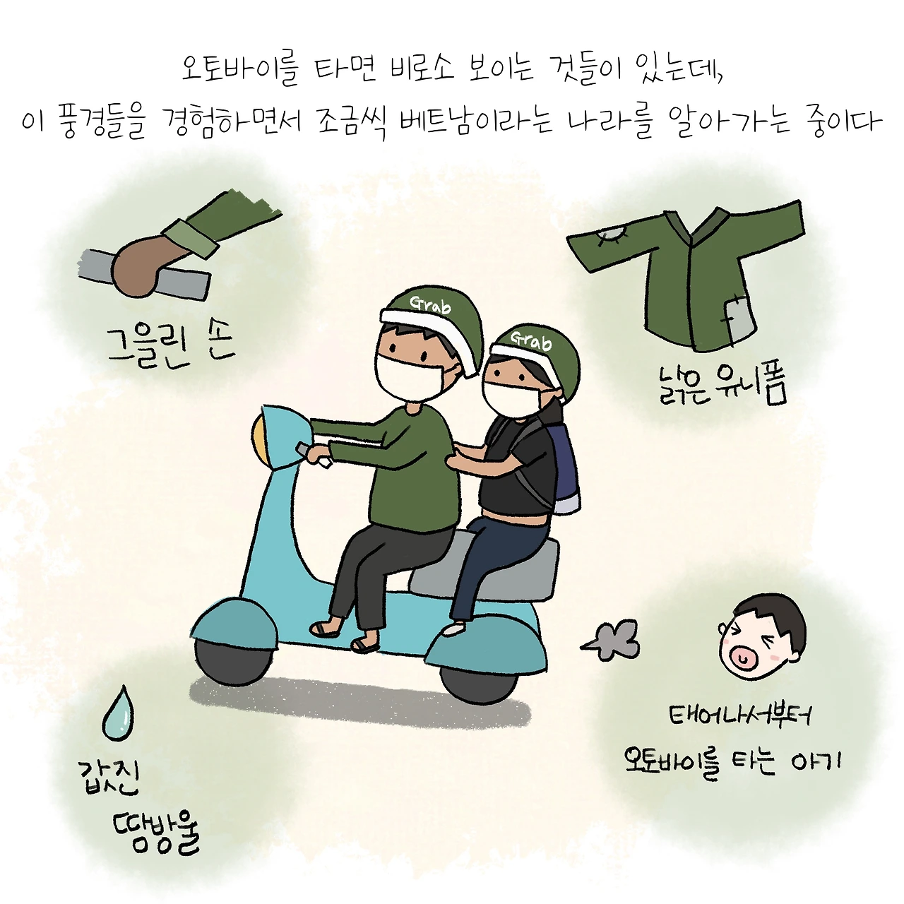 베트남에서 차를 타고 다니면 한국보다 더 교통비가 많이 들기 때문에 멀지 않은 거리는 저 역시도 오토바이를 종종 타고 다닙니다. 그랩이라는 앱 서비스를 이용해서 오토바이를 호출하면 목적지까지 데려다주는 동남아에서 꽤 유명한 서비스인데요, 오토바이가 주된 교통수단인 베트남이기에 이곳에 사는 동안 그들의 삶을 좀 더 가까이서 들여다보고 경험해보고 싶었답니다. 오토바이 뒷자리에 앉아 있으면 차를 타고 다닐 때는 볼 수 없었던 것들을 많이 볼 수 있습니다. 강가에서 낚시를 하는 사람들, 다양한 모습으로 오토바이를 운전하는 사람들, 태어난 지 얼마 되지 않은 아기, 엄마 아빠에게 몸을 맡기고 오토바이를 타는 어린이들 또 아기들이 쓰고 있는 알록달록 귀여운 헬멧들까지 말이죠. 그리고 무엇보다 열심히 살아가고 있는 베트남 사람들을 가까이서 만날 수 있습니다. 검게 그을린 손으로 부지런히 오토바이를 몰고 다니는 한 사람의 가장을 말이죠. 부모가 된다는 건, 누군가를 책임지며 살아간다는 건 분명 고되지만 이토록 숭고하고도 대단한 일인 것만 같습니다. 세상의 모든 엄마, 아빠 만세!