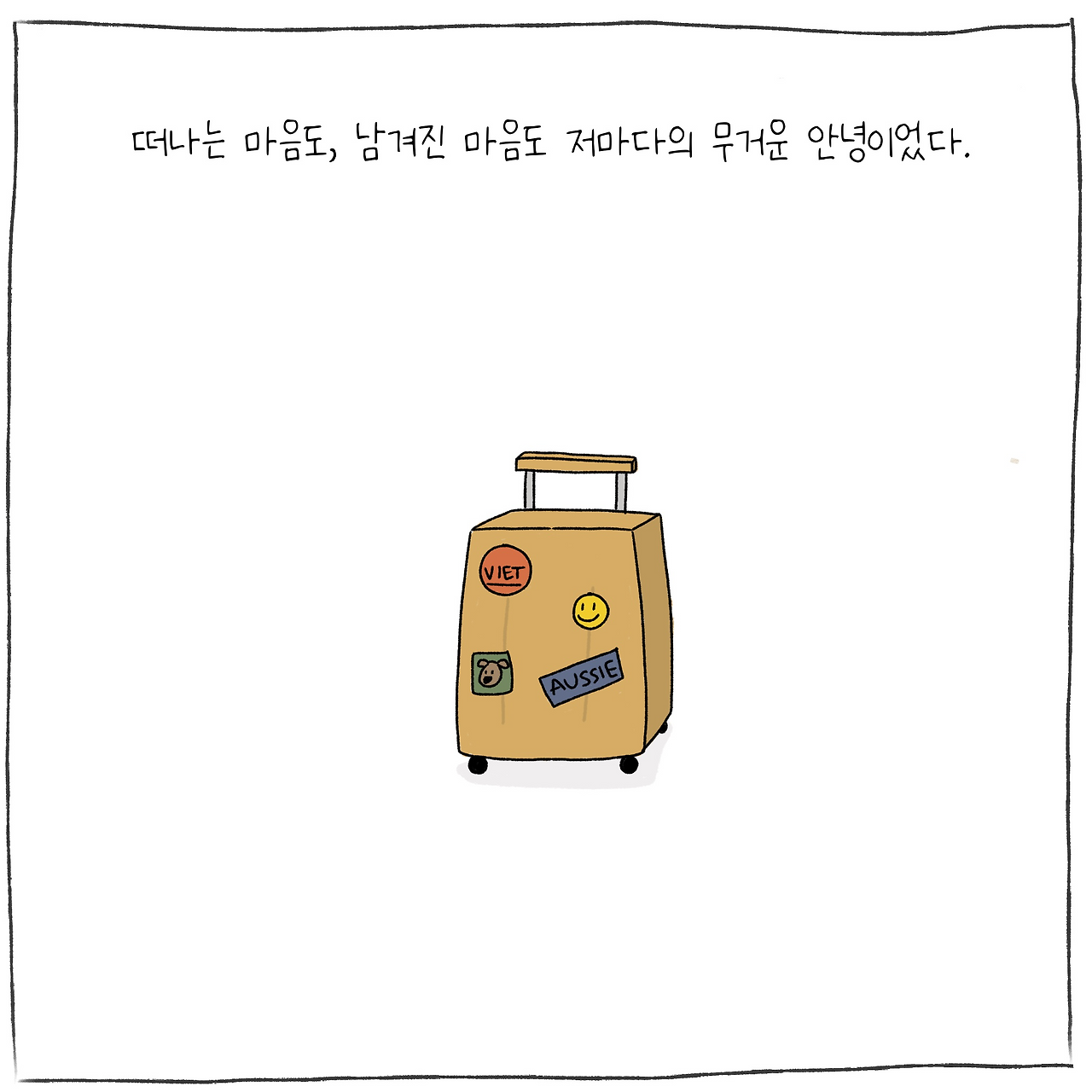 심한 감기로 골골거리는 아이는 공항으로 향하는 동안 착한 아이처럼 쌔근쌔근 잠들었습니다. 공항에 도착했을 때, 남편은 잠든 아이를 애써 깨우지 말고 차를 돌려 가라고 했고요. 출발이라고 쓰인 게이트 앞에서 캐리어를 꺼내는 남편을 보고 있노라니 울컥거리는 마음을 숨길 수가 없어 눈물을 펑펑 쏟고 말았지요. 그렇게 남편을 공항에 남겨두고 정신없이 집으로 돌아오는 길, 아빠를 찾는 아이의 목소리를 들으며 고속도로를 달리는 내내 눈물을 훔쳤습니다. ‘잘 살고 싶어서’하는 지금의 선택들을 통해 나는 과연 ‘잘 살고 있는 것’인지 몇 번이고 의문을 가지면서 말입니다.