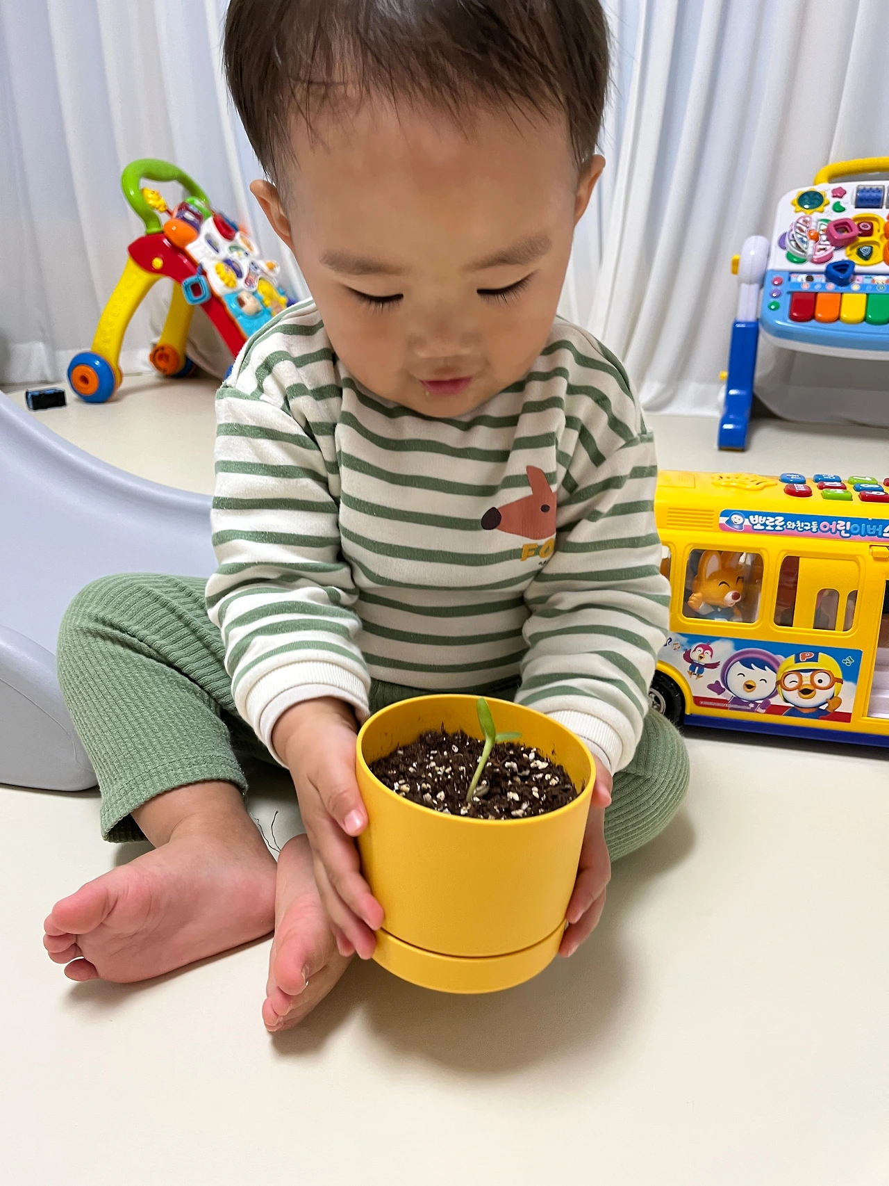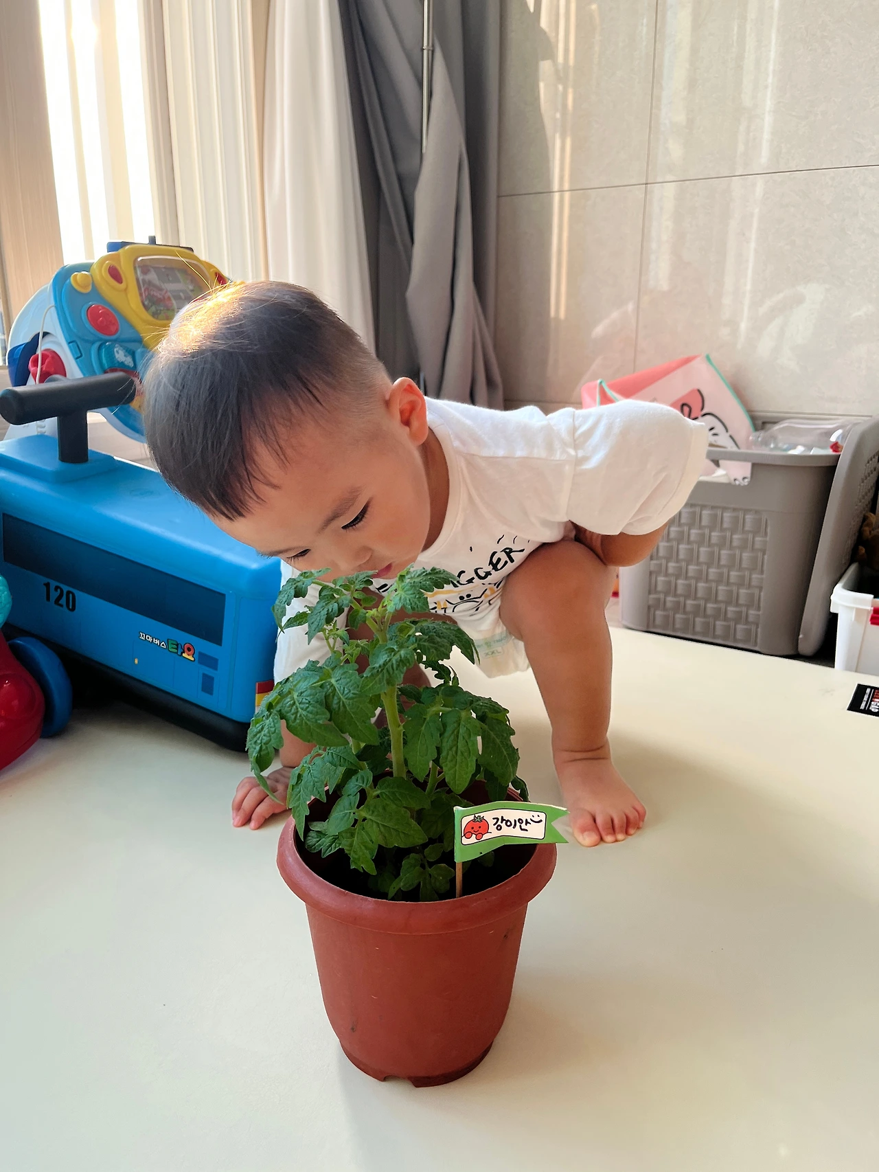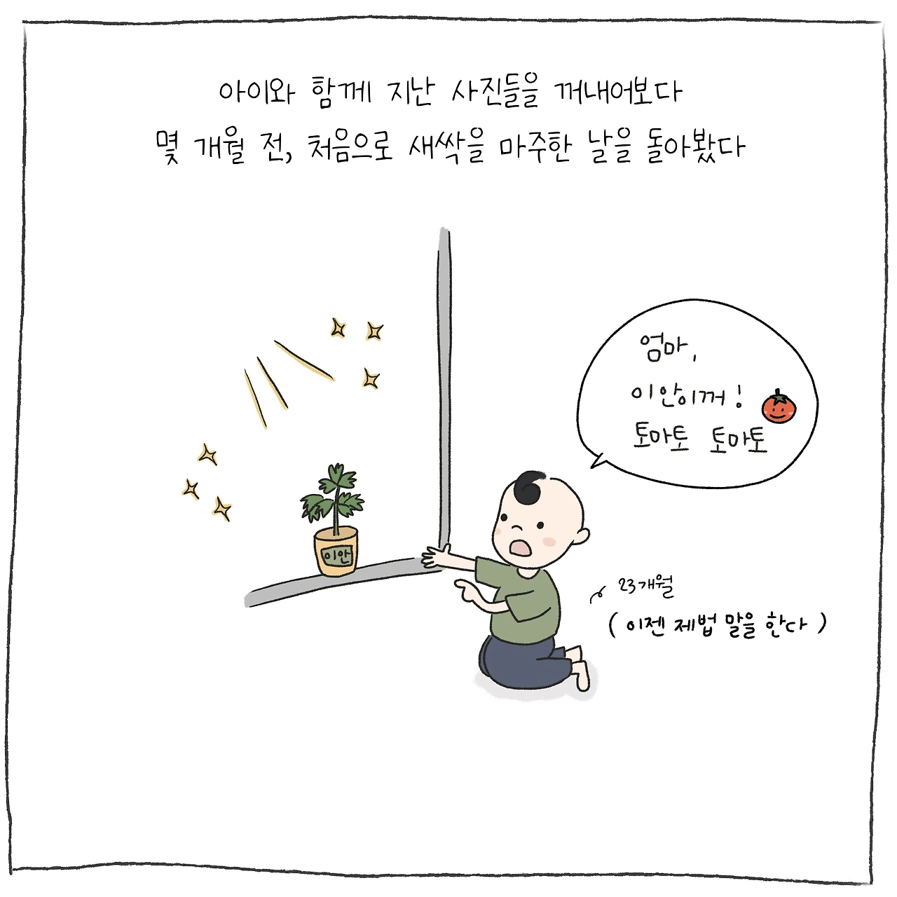 아이의 첫 반려식물이 되어 준 방울토마토. 아이가 첫 사회생활을 시작한 19개월에 심었는데 벌써 아이는 23개월의 어린이가 되었습니다. 식목일에 결석을 하는 바람에 어린이집 화단에 아이의 식물만 없어서 등원할 때마다 조금 섭섭한 마음이었는데 뒤늦게 아이만의 작은 식물이 생겼고 아이는 자주 창가로 달려가 방울토마토와 해바라기를 들여다보곤 했습니다. 그렇게 5개월이 눈 깜짝할 새 흘렀고 공모전 지원을 위해 아이가 방울토마토 모종과 함께 찍은 사진들을 꺼내어보다가 가슴 한편이 뭉클해지고 말았습니다. 작고 여리던 아이가 어느 세월에 이렇게 자라난 것일까요.