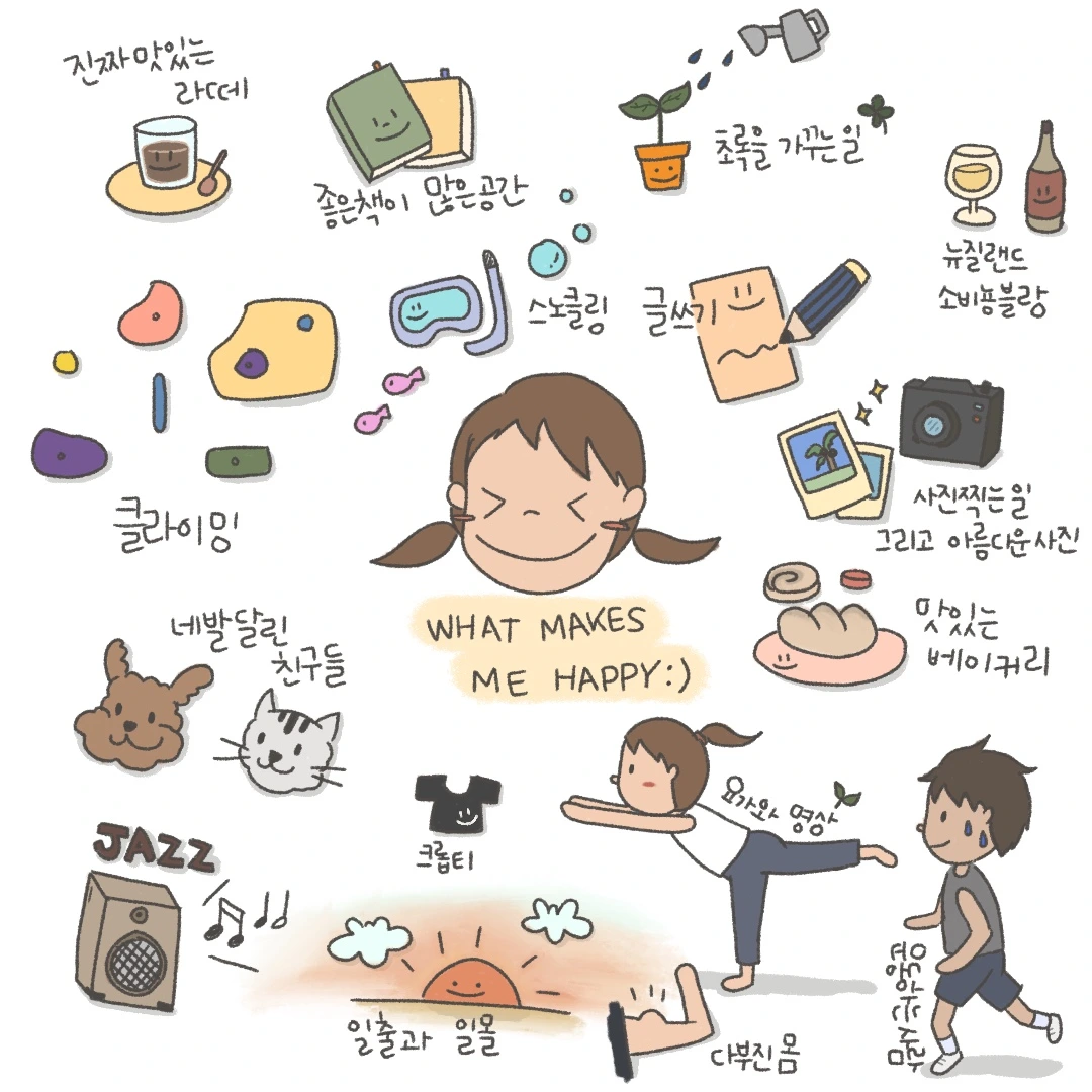 아직 근사한 직업을 가지거나 돈을 벌지는 못하지만, 남편은 나의 지금을 아낌없이 지원해 주고 응원해 준다. 마음이 여유로운 사람과 살 수 있는 것은 감사한 일이라는 생각을 하게 된다. 무겁지 않은 주머니로도 하루의 행복을 충분히 채울 수 있다. 해 뜨는 시간에 심바(우리 집 반려견이다!)와 오붓하게 산책을 가고, 동네의 배고픈 강아지에게 간식을 조금 나눠주고, 구글맵에서 멋진 카페를 찾아 매일 짧은 여행을 떠난다. 좋은 영감을 받은 날에는 서너 시간을 꼬박 앉아 그림을 그리거나 글을 쓰는데 그렇게 무언가를 해내고 돌아온 날은 내 자신이 한 뼘 자란 기분이 된다. 그렇게 기쁜 마음으로 하원 차량에서 내리는 아이 손을 잡고 놀이터에서 신나게 땀을 흘린다. 미끄럼틀을 신나게 타고 있는 아이를 보면서 삶의 보람을 한 스푼 얻어 집에 돌아온다. 친한 사람들에게 직접 찍은 사진을 인화해서 선물을 하기도 하고, 남편과 함께 피클볼을 치기도 한다.