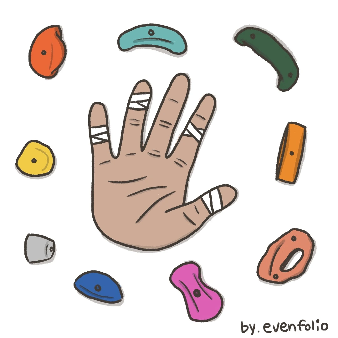 열심히 홀드를 잡고 오르내리다 보면 자연스럽게 손 끝과 손바닥 구석구석 굳은살이 자리 잡기 시작한다. 오늘은 반창고를 들고 헤매는 내 손을 도와 클라이밍장 친구가 정성껏 테이핑을 해주었다. 반창고가 까맣게 될 때까지 신나게 매달리고 박수를 받고 친구를 응원하며 오늘도 아주 조금 자랐다.