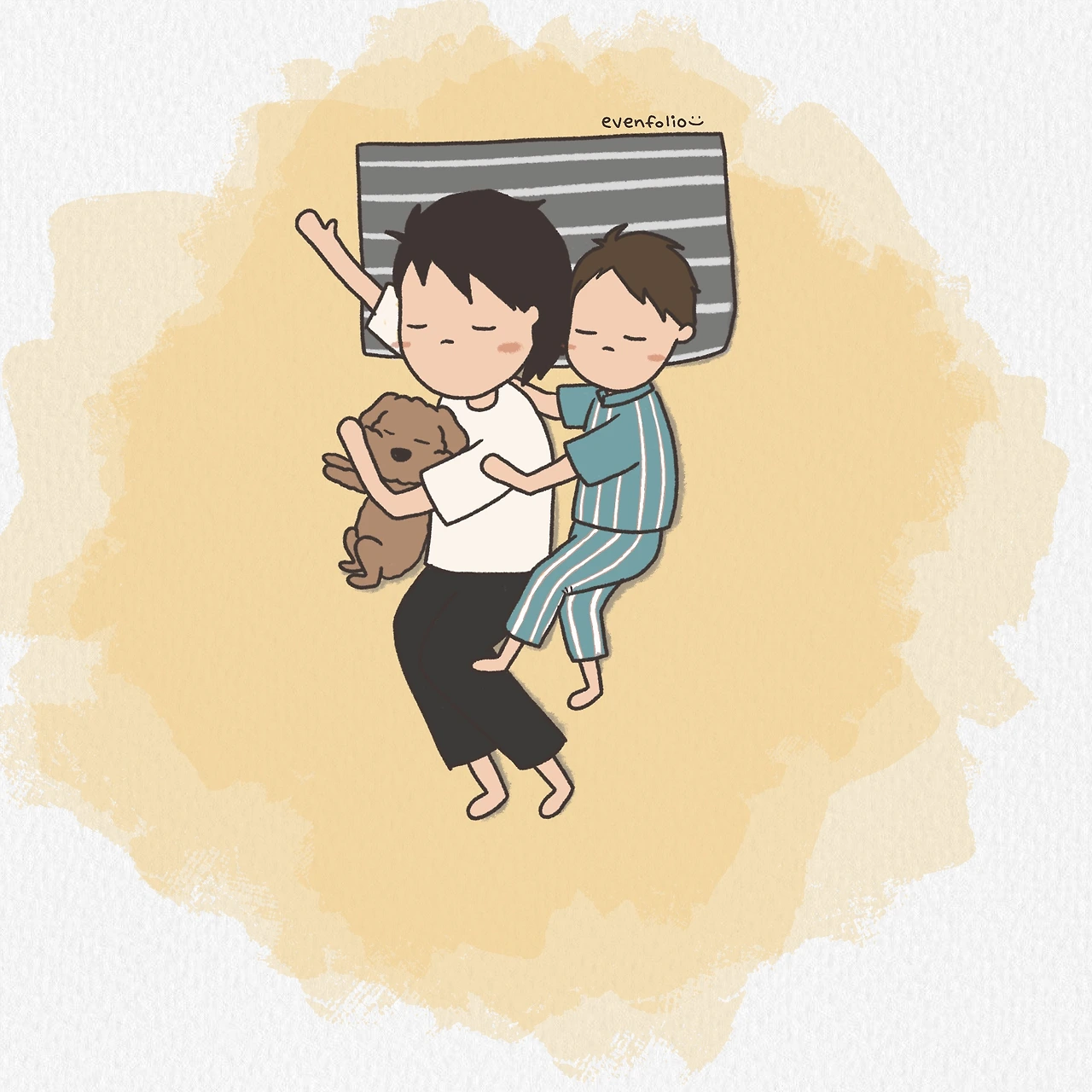 아이가 어릴 땐 셋이 함께 눕는 일이 거의 없었지만, 다섯 살을 넘긴 지금은 나란히 누워 잠드는 풍경이 꽤나 익숙해졌습니다. 두 녀석은 엄마가 누운 모습을 바탕으로 마치 테트리스를 하듯 자리를 기가 막히게 찾아내어 몸을 눕힙니다.
