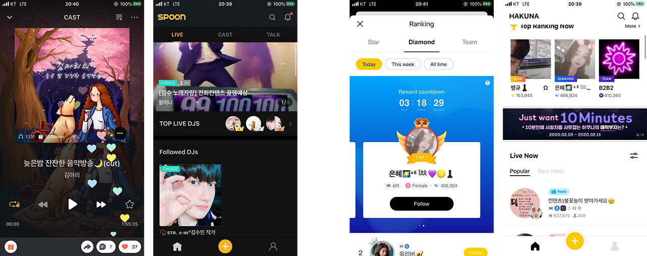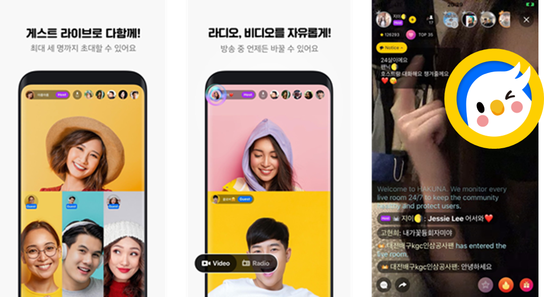 1. 기본적으로 하쿠나랑 스푼은 보이스 기반 라이브 방송이 주요기능이고 DJ들에게 현금 후원하는 게 수익모델. 다른 점이 있다면 하쿠나의 경우 비디오/오디오 동시 기능 송출이 지원되고 방송중에도 오디오/비디오 전환이 된다. 그리고 게스트 초대해서 다같이 방송할 수도 있는데 하쿠나 쓸때 다같이 방송하는건 생각보다 많이 못 봄.