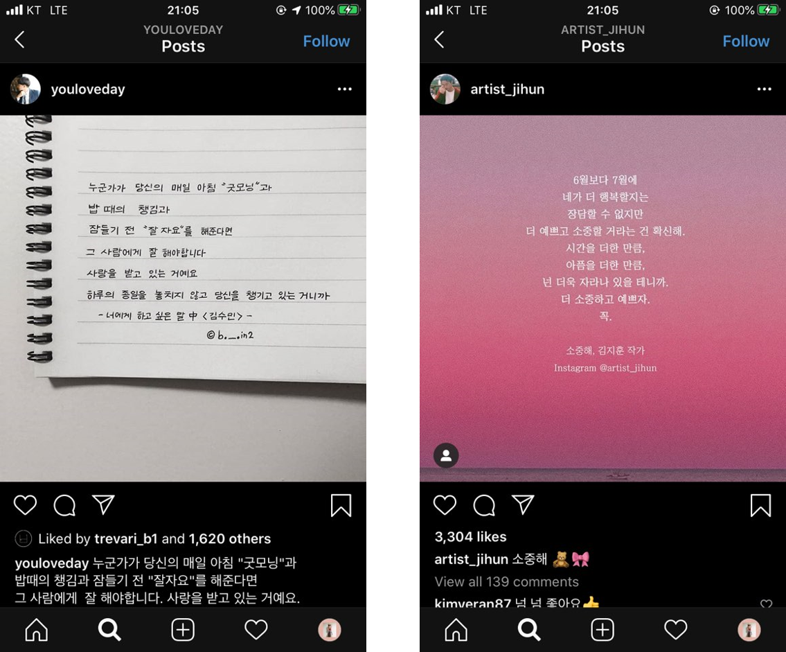 3-1. 스푼라디오에서 인기 DJ인 김수민작가는 인스타 김지훈작가와 굉장히 그 감성의 결이 같다. 둘다 여성적인 문체로 따듯하고 스윗한 연애/사랑 관련 콘텐츠에 집중한다. 또는 자존감/위안 관련 콘텐츠.
