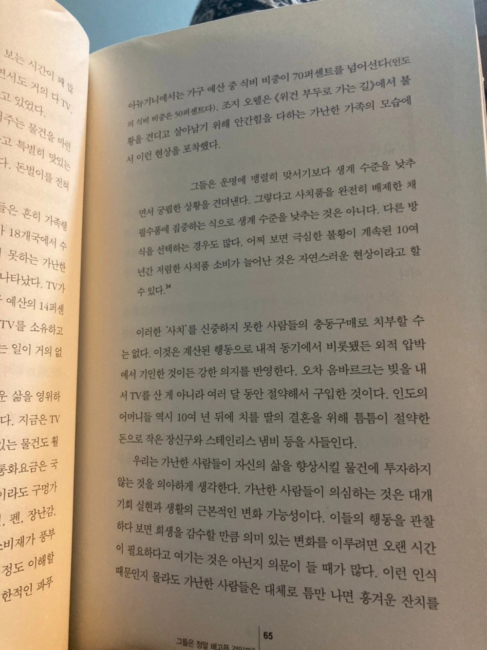 제일 흥미로운 부분은 3장에서 고열량 식품, 말라리아 모기 방지 텐트, 예방접종과 같은 빈곤을 탈피할 수 있는 따기 쉬운 열매(쉬운 방법) low hanging fruit가있음에도 불구하고 빈곤층은 절대 그런 것을 선택하지 않고 장기적인 빈곤 구제책보다는 단기적인 소비(맛있는 음식 등)를 계속해서 선택한다, 그래서 빈곤의 악순환이 계속된다 라는 것이었다. 빈곤층이 계속해서 자기 자신을 빈곤층에 머무는 선택을 한다는 것이다. 그 원인은 장기적으로 지금의 상황이 나아질것이라는 믿음과 사고, 희망이 없기 때문이다.