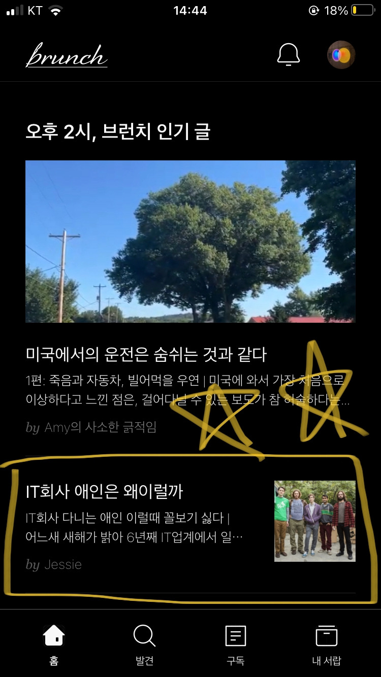 아니 이게 무슨일이에요??? 휴가 중이라 조회수 안보고 있었는데 며칠전 발행한 <IT회사 애인은 왜그럴까> (https://brunch.co.kr/@jessietheace/533) 가 오늘 오후 두시 브런치 인기글이 되었어요!! 보니까 올린 첫날 9천뷰 그다음날 1만뷰나 찾아주셨네요