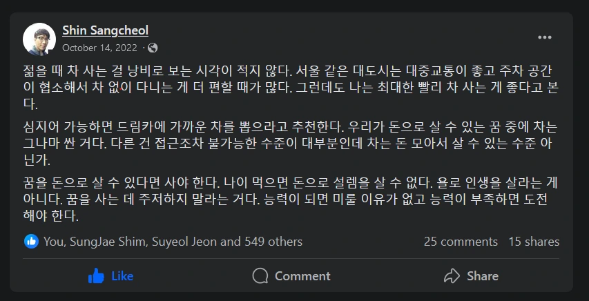 - 차량만 있으면 동탄에서 서울까지 출퇴근 할수도 있고, 한달이나 한분기에 한번씩 엔진오일 갈고 타이어 갈고 하면서 티스테이션이나 이런저런데도 다녀보고, 타이어는 어떻게 양질의 타이어를 싸게살수 있는지 주유 카드는 어떻게 만들고 자동차 시장에 대한 이해도도 높여볼수 있고, 강원도나 가평 레저 산업과 호스피탈리티 산업에도 더 가까워지죠. 저는 지금 차산지 3년좀 안됬는데 차가 없던 제 시절이 기억이 안납니다 대체 그땐 어떻게 살았는지.... 우리가 서울 안에서 뺑뺑이 돌며 일 집 일 집 하는 사람 아니잖아요. 지방 고객이나 공장방문을 갈수도 있고 떠나고싶을땐 훌쩍 떠날수 있고. 젊어서 무릎 안아프고 더 많은 걸 보고 체험해볼 체력이 있고 할때 오히려 차가 있어야 되는거 아닐까요? 노년부부가 차가 필요없어서 파는 것과 젊었을때 차가 필요한 건 같은 순리입니다. 물론 그에 맞는 지출 관리는 필수입니다.