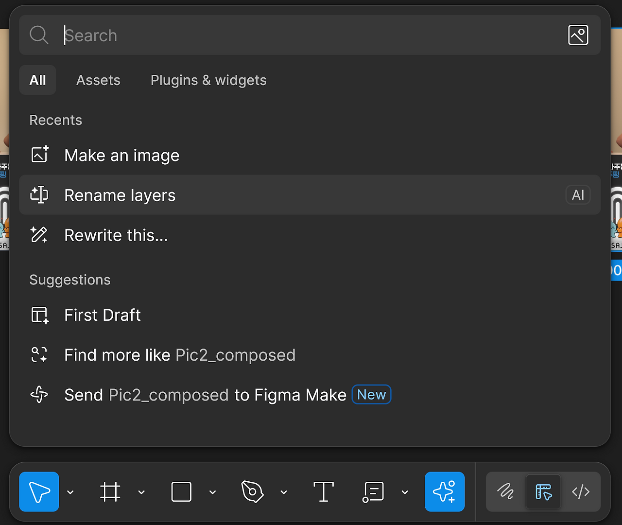 Figma AI 기능은 유료 플랜 유저들만 사용할수 있는데, 이번에 AI 기능 뿐 아니라 자주 사용하는 도구들(펜툴 등)은 중앙 하단 패널로 빠졌다. 또한 아이폰에서 일일히 메뉴를 찾을것 없이 검색하면 원하는 메뉴를 찾을수 있는 것처럼 AI 기능 뿐 아니라 다른 기능들도 기능 명칭을 검색하면 기능, 에셋, 플러그인 모두에서 필요한 기능들을 호출할수 있다. 개인적으로 어쩌다 한번씩 피그마를 켜니까 패널 구성이나 어디에 어떤 기능 있었지? 가 헷갈렸는데 나한테는 작업 속도를 늘려주는 변화라서 만족함.