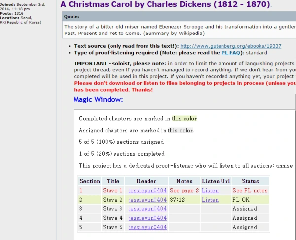 작년 2014년 크리스마스 날, 2009년에 상영된 <크리스마스 캐럴> 영화를 본 기억이 있었다. 옛날부터 책도 읽어보고, Librivox 녹음 파일도 들어보았지만, 영화보다 생생한 건 없을 것이라는 생각이 들었다. 그 영화를 인상적으로 보고 나서부터 '크리스마스 캐럴' 이야기에 푹 빠지기 시작했다. 그리고 그 책이 얼마나 Librivox에서도 유명한지 여러분들에게 직접 얘기해보고자 한다.