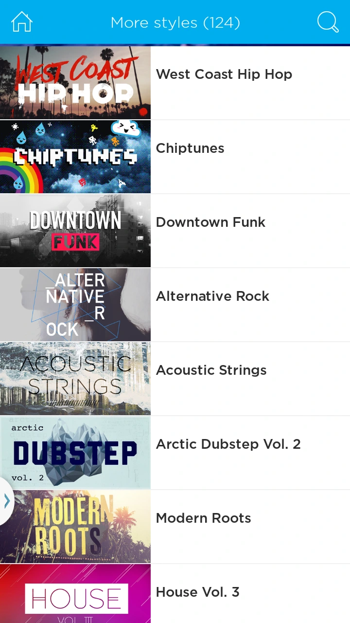 여기에서는 여러가지 루프(Loop) 또는 샘플 (Sample)들이 있는데, 스트링(Strings), 퍼커션 (Percussion), 드럼, 기타, 베이스, 우드윈드(Woodwinds), 관악기 등의 리듬과 음의 샘플들이 가득 들어있는데, 그 루프들을 섞으면 아름다운 음악이 탄생하게 됩니다. 그리고 각각 장르가 있습니다.