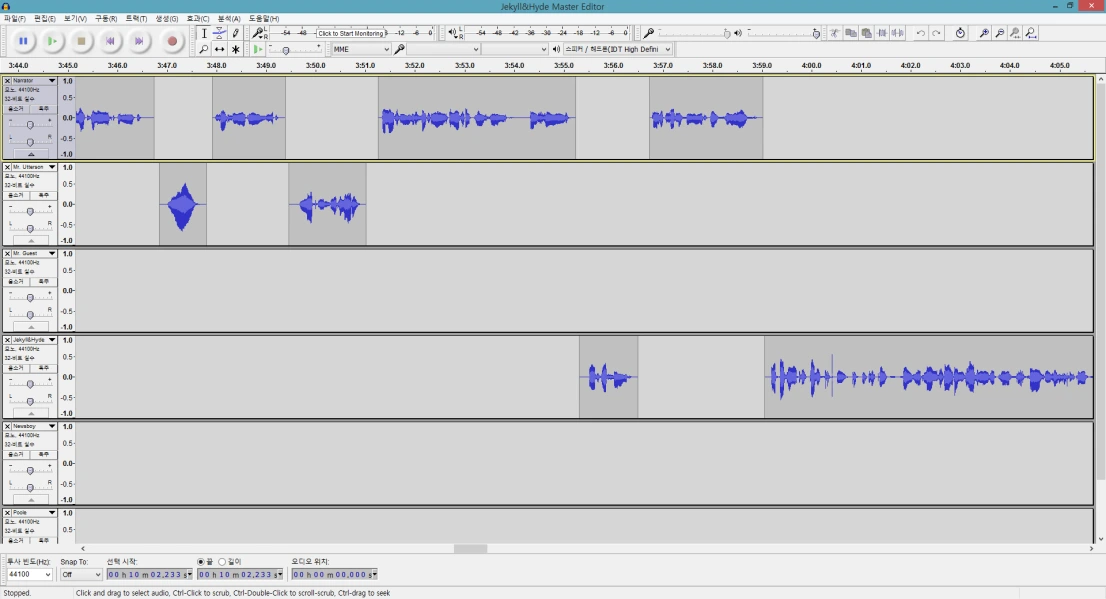 4. 먼저 단축키 Ctl + Shift + N을 눌러서 빈 트랙을 캐릭터 수 만큼 생성시킨 다음 각각에 이름을 붙인다. 그러고는 대본에 따라 각각의 대사를 쪼개어 타이밍에 맞게 붙인다. 아래 사진은 쪼개어 붙인 프로젝트의 일부분이다.