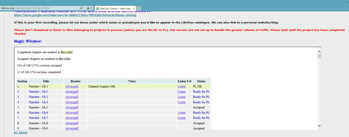 맨 첫 프로젝트에 들어왔을 때에는 모두 텅텅 비어 있을 것이다. 이제 여러분들이 MW를 직접 업데이트를 해야 한다. 2번에서 챕터 제목을 순서대로 적고, 읽은이를 업로드해야 한다. 하는 방법은 위에 있는 'Assign Reader Sections'라는 이름이 있다. 그리고 맨 앞에 있는 칸에 당신의 유저 이름을 적는다. 만약 나오지 않는다면 운영진에게 당신의 유저 이름과 카탈로그 이름을 부탁한다.