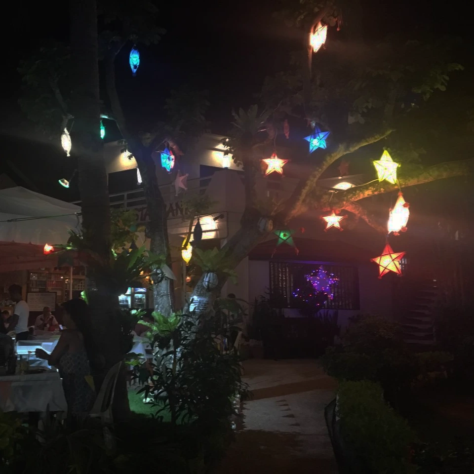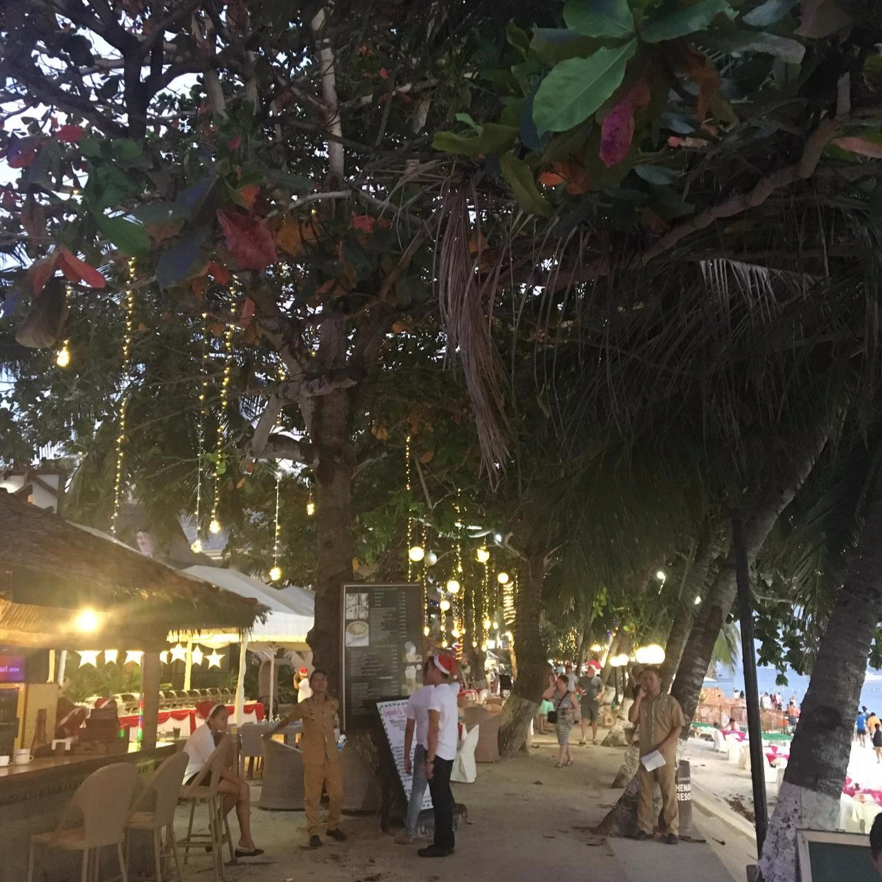 1년 365일 관광객들로 붐비는 아로나 해변이지만, 이 기간은 좀 더 특별하다. 해변가의 모든 식당들은 아기 예수의 탄생을 축하하는 별을 비롯해 크리스마스를 상징하는 온갖 장식들을 내걸고 이른 저녁부터 불을 반짝인다. 점원들도 반팔에 반바지 차림이지만 하얀 털이 달린 산타 모자 쓰는 것은 잊지 않는다.