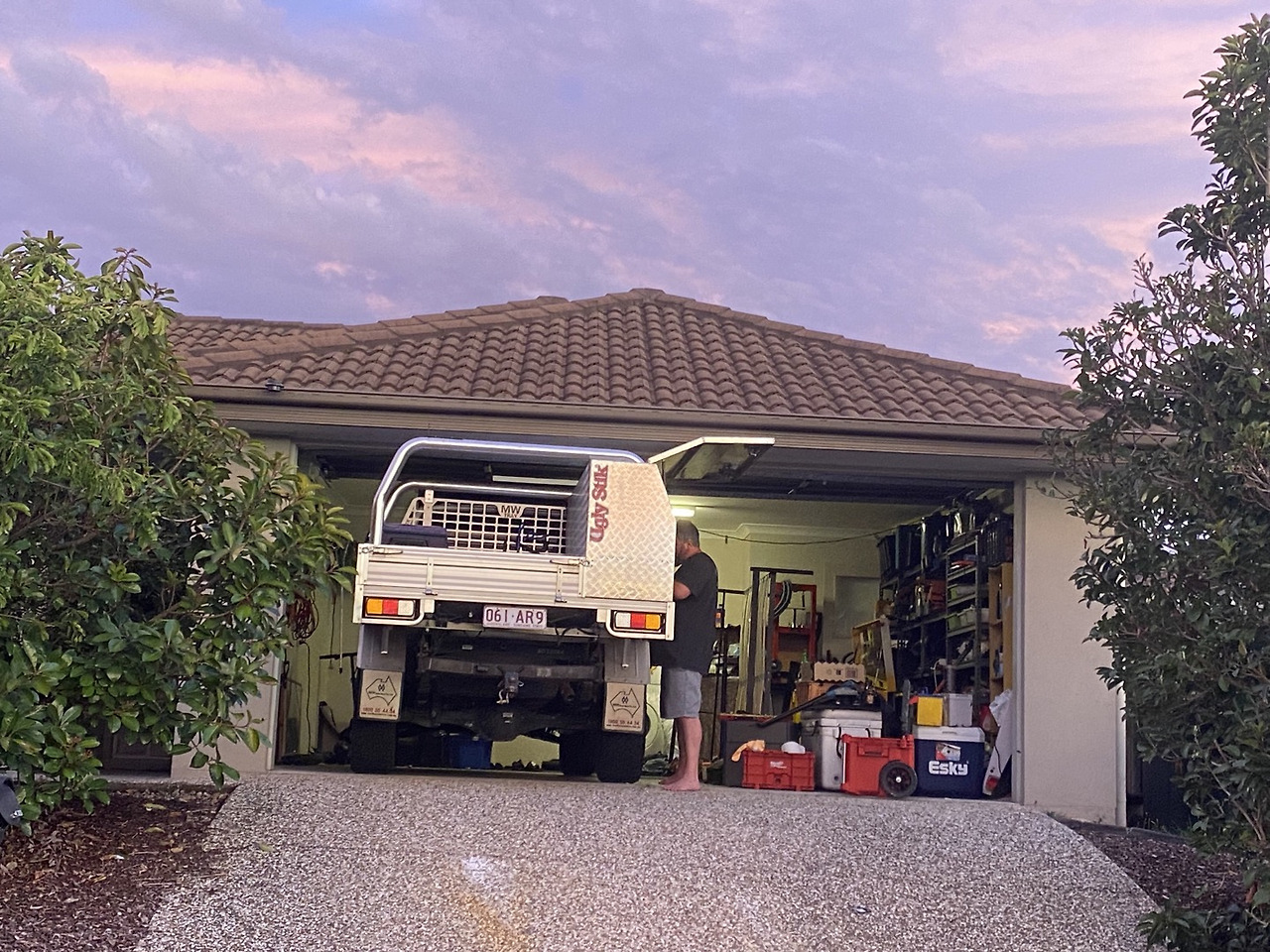 어제 산책 나왔을 때도 남자주인이 열심히 차를 수리하고 있었는데, 오늘도 마찬가지이다. 많은 남자들이 차고에 여러 가지 공구를 갖추어 놓고 차를 직접 수리한다고 하더니만, 이 남자가 그 전형인 것 같다.