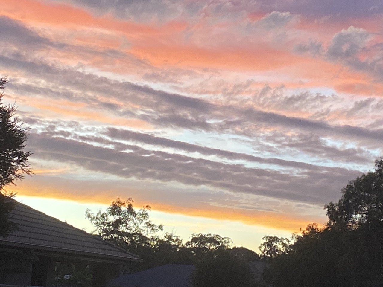 신기한 저녁노을이다. 왜 이렇게 다양한 모습을 보이는지는 알 수가 없다. 저녁노을은 마치 하늘에서 누가 색칠을 다시 하기 위해 물감 묻은 붓을 물통에 넣고 마구 흔들어 붓을 헹굴 때, 물에 번지는 색상의 다양한 모습과 같은 느낌이다. 지금이 하늘 개구쟁이들의 미술 시간인가?