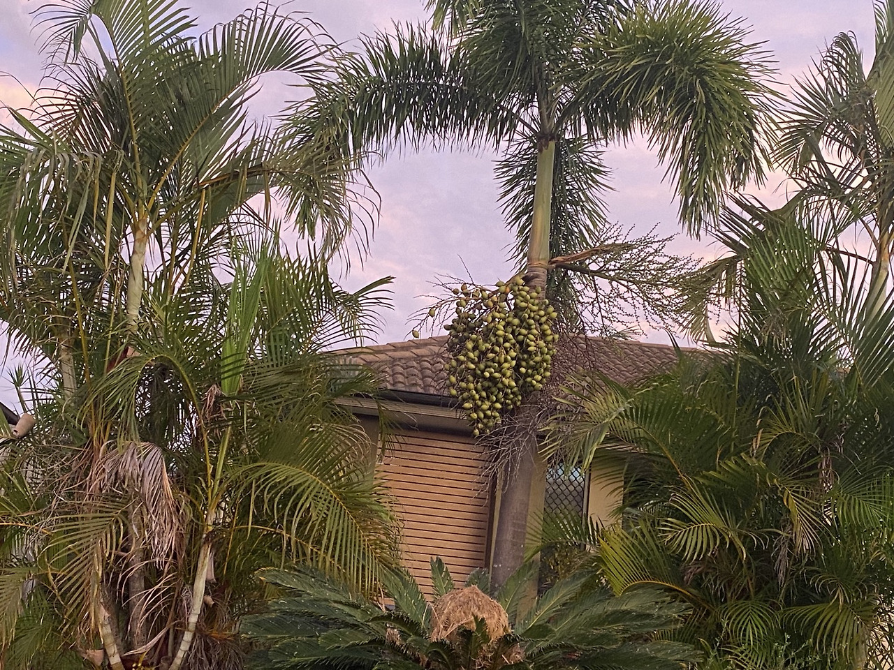 어느 집 앞의 야자나무는 열매를 주렁주렁 매달고 있다.