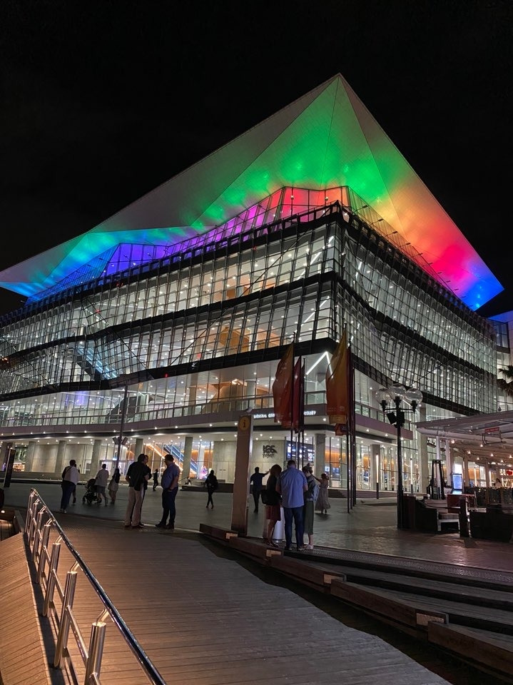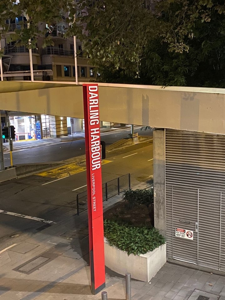 다아링 하버에서 나오는 길 옆 이 건물에도 불이 번쩍거리고