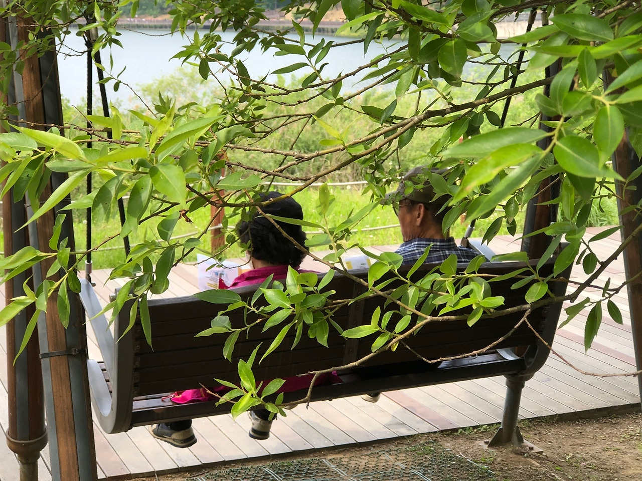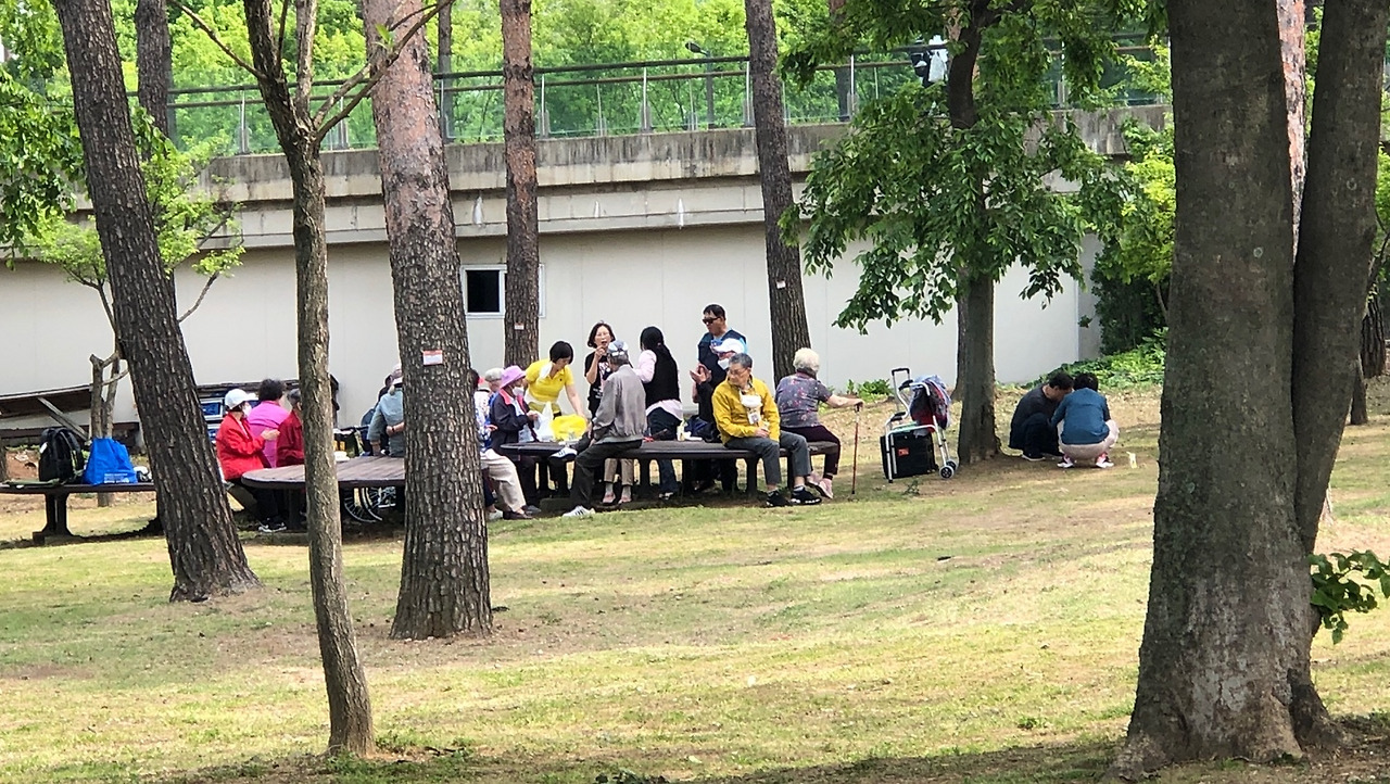 생명이 진동하는 공원에 연세 드신 분들이 단체로 '생명숨 들이마시기 나들이'를 오셨나 보다. 한 젊은 여자분이 일어나 이 노인들의 흥을 돋우기 위해 열심히 율동(혹은 춤동작)을 한다. 노인들은 그 여자분을 물끄러미 쳐다볼 뿐 좀처럼 가짜 생명(흥)에 동요하지 않는다.