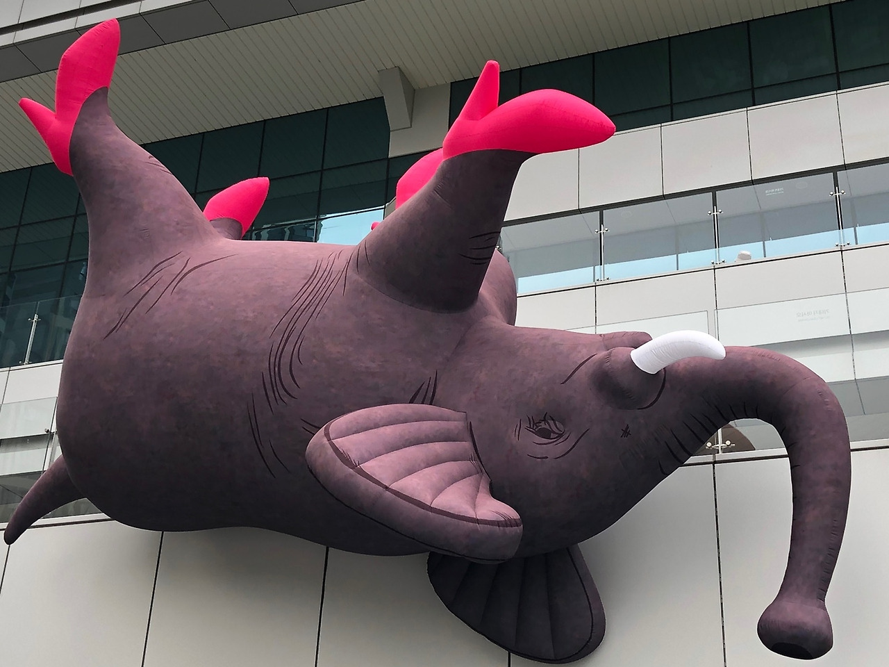 탐욕의 상징인 빌딩 위에 벌러덩 드러누운 이 아기코끼리나