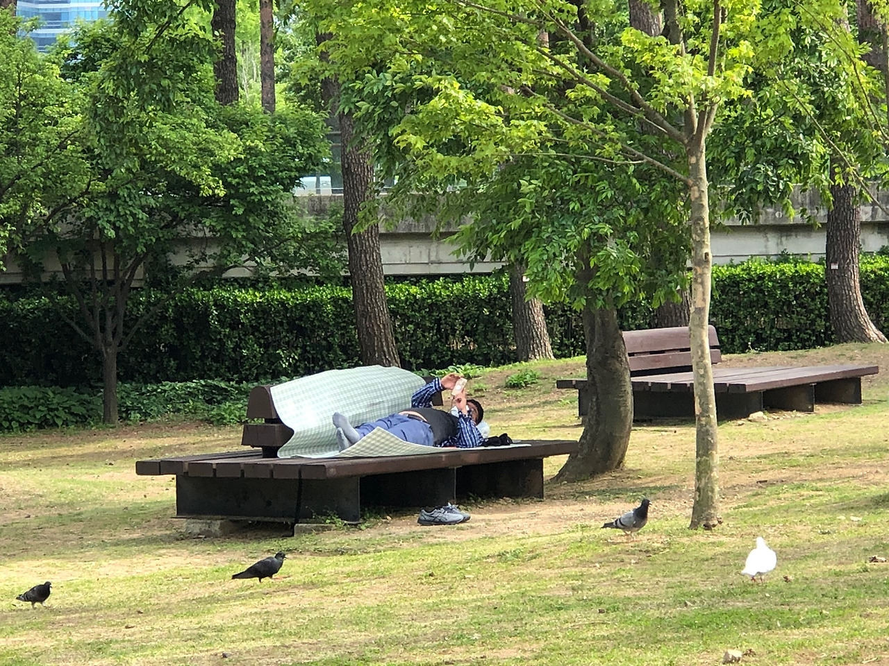 노인들 옆 벤치에는 아예 자리를 깔고 누워 있는 한 사람이 있다.