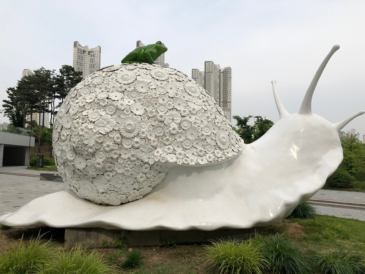 시선 강탈의 찬란한 무늬의 흰 옷을 입고 자태를 뽐내는 이 달팽이보다