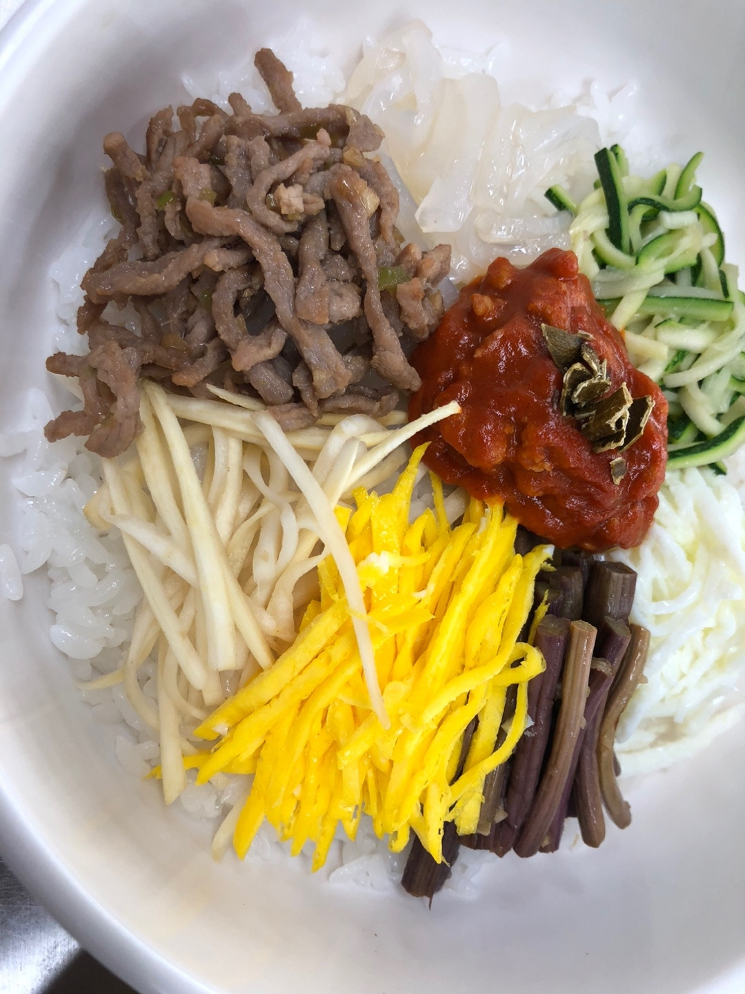 3. 비빔밥: 시험시간 50분짜리이다. 쌀, 청포묵, 고사리, 소고기, 애호박, 도라지, 달걀, 소금, 진간장, 백설탕, 대파, 마늘, 검은 후춧가루, 참기름, 깨소금, 고추장, 식용유, 건 다시마--재료손질이 많이 가는 작품이다.(통마늘은 다지기를 잘해야 한다. 모든 학생들의 불만이 집에서 다 찧어놓은 마늘을 사용하는데, 여기서 마늘 까고 찧고 하는 일이 힘들다고 야단이다. 또한 위에 올라가는 재료의 길이를 교과서의 요구대로 맞추어야 한다.