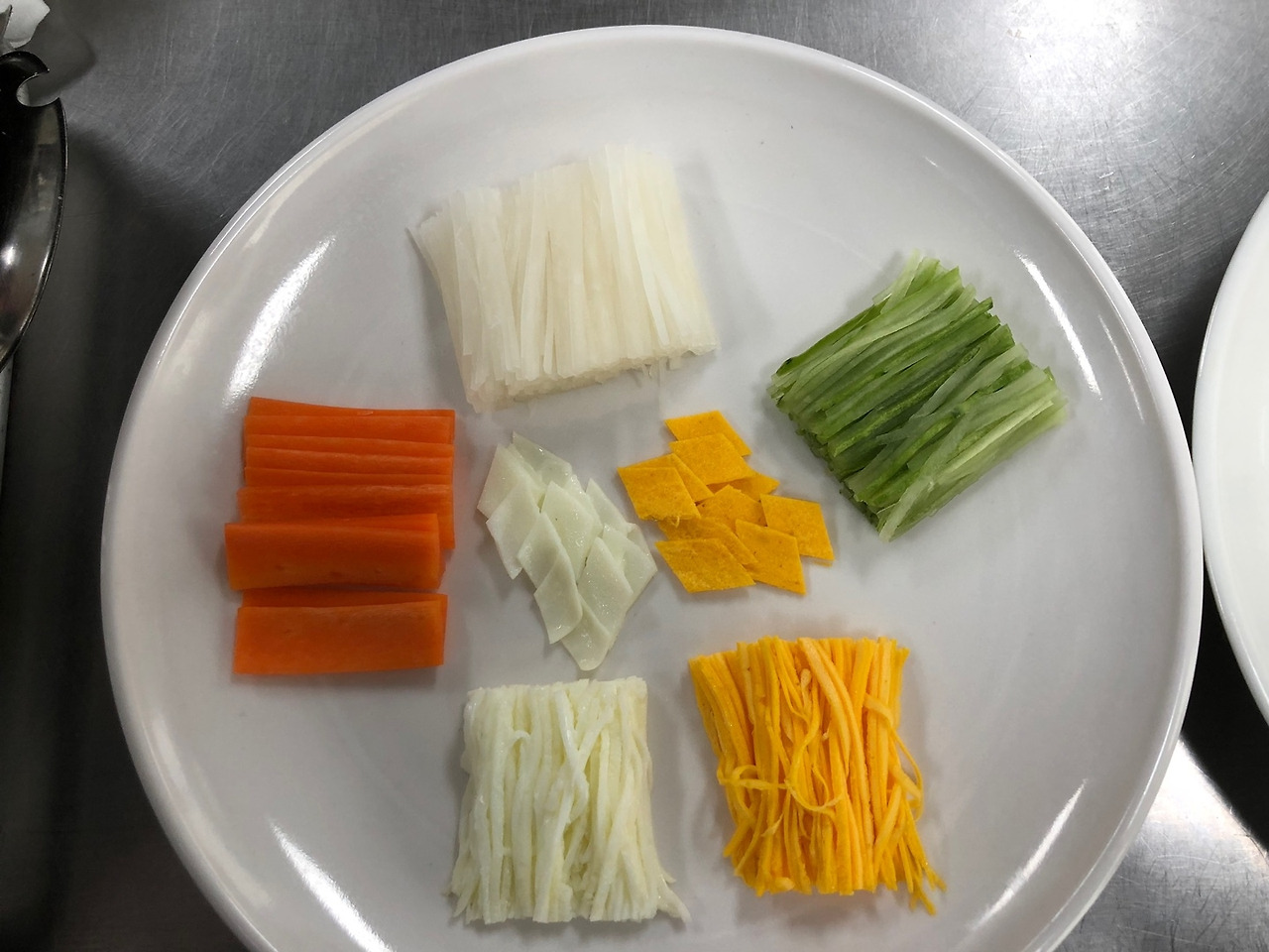 1. 재료 썰기이다. 이게 시험문제에 나온다. 무:0.2cm 두께, 0.2cm 폭, 5cm 길이 채썰기, 오이:0.2cm 두께, 0.2cm 폭, 5cm 길이 돌려 깎기, 이런 식이다. 주어진 재료를 잘 사용하지 못하면 필요한 양이나 모양이 나오지 않을 수 있다. (시험시간 25분짜리이다)