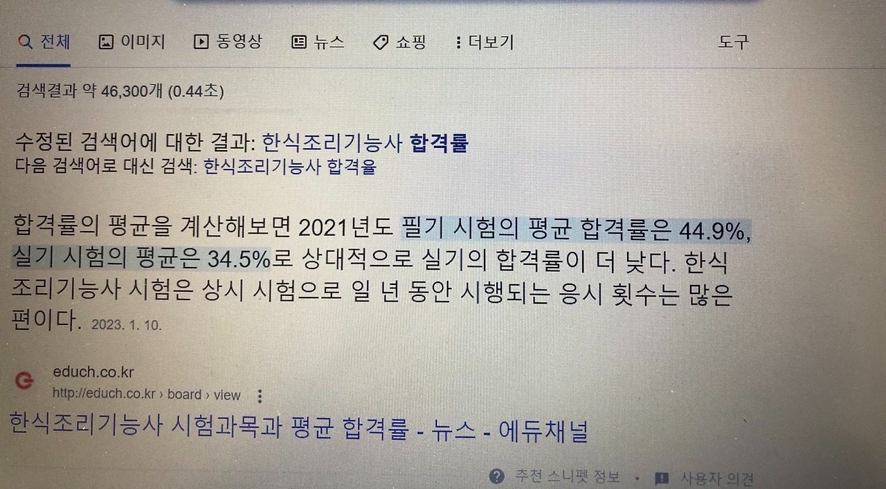P.S 한식 조리기능사 시험에 관심을 가지고 있는 사람이 의외로 많았다. 그래서 조금이라도 도움이 될까 봐 이 글을 쓴다. 그리고 개인적으로 이 글을 쓴 후, 나의 사진 저장고에서 이 사진들을 제거하기 원하기 때문이다.