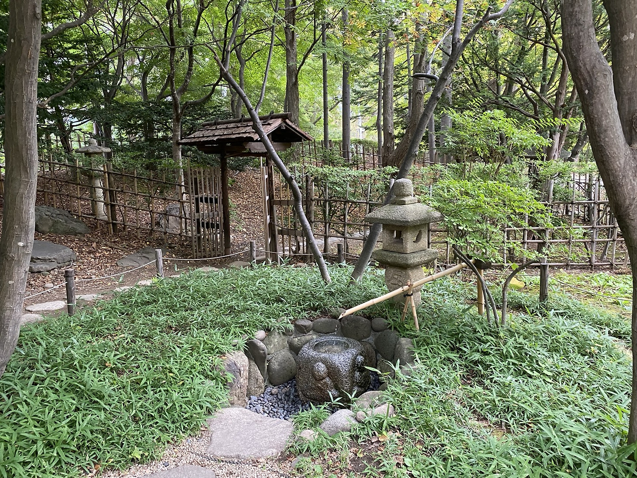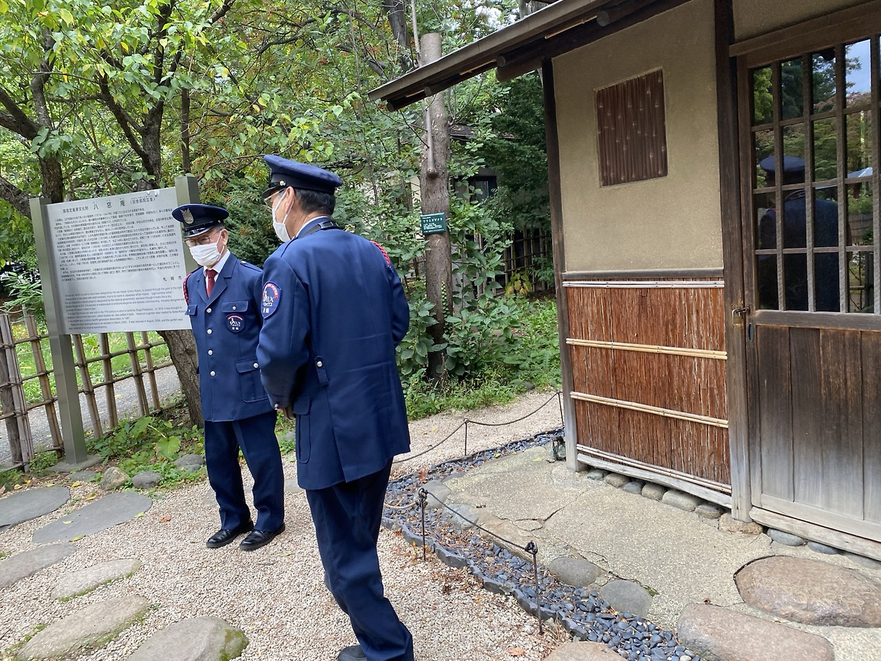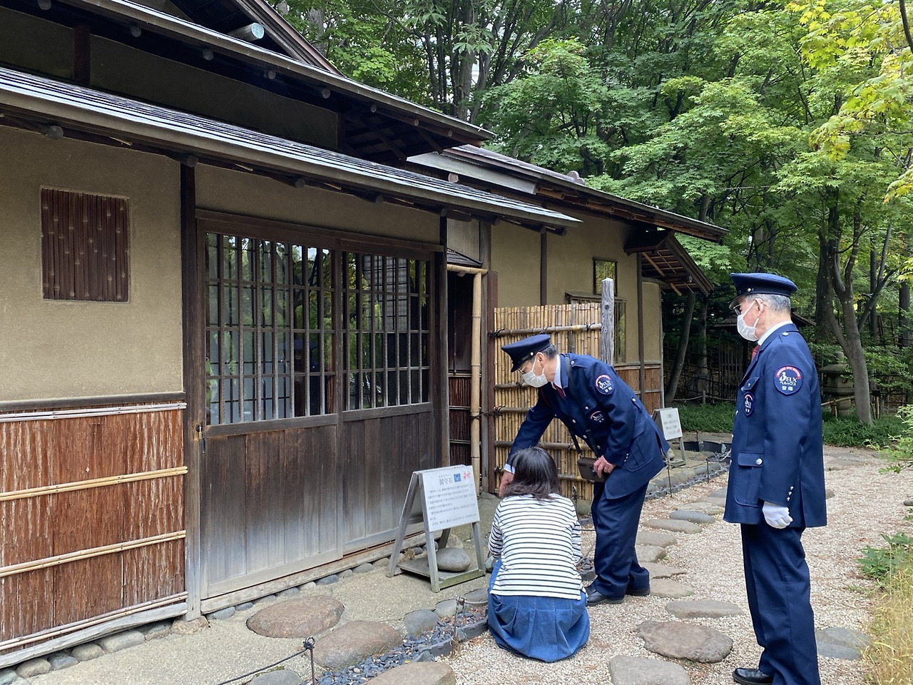 그리고 옛날의 차 마시는 전통 가옥이 옮겨져 있다. (직원들이 일찍 출근하여 정리를 하고 있는데, 일본은 공원 관리사나 기차표 검사하는 사람이나 다 이런 제복을 입고 있었다.)