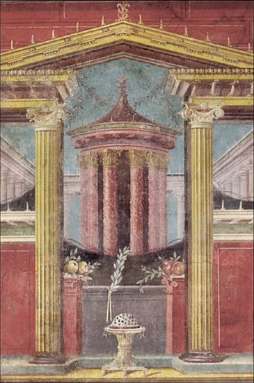 그러나 거의 유일하게 기원전 1세기 로마, '보스코레아레의 파니우스 시니스터 저택[villa of P. Fannius Synistor at Boscoreale) 유적에서 '1점 투시 소실점'이 적용된 벽화가 발굴되었습니다. 하지만 장구한 2천 년 세월을 견뎌낸 회화 작품은 아무래도 희귀할 수밖에 없으므로 당시 회화 기법이 어땠는지 분명히 알 수는 없습니다.