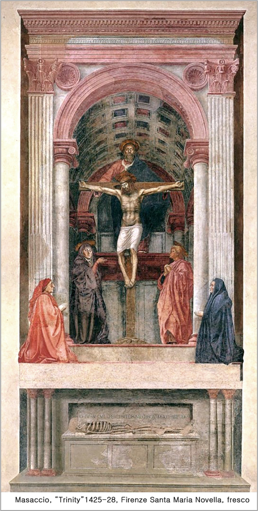 보고서도 믿기 힘들 때 신기하다고 하는데 그건 상식 이상의 원리를 경험할 때 하는 말입니다. 그런 일이 미술사에서도 찾을 수 있는데, 이탈리아 화가 마사초[Masaccio, 1401-1428]가 '피렌체, 산타 마리아 노벨라 성당'에 그린 벽화 ‘성삼위일체 Trinity’ [1425-28]입니다.