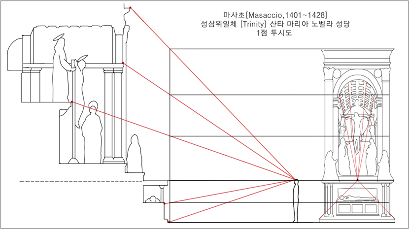 벽화 '성삼위일체'가 그려지게 한 선원근법(1점 투시도)을 체계화 한 사람은 피렌체의 건축가 브루넬레스키[Filippo Brunelleschi 1377-1446]입니다. 그는 마사초가 아직 미술 공부를 하고 있던 1415년, ‘원근법 실험’을 통해 눈으로 볼 수 없지만 실재하는 하나의 소실점이 무엇인지를 규명했습니다. 실험 후 그 내용을 담은 책의 출판에 이어 10여 년 뒤 마사초가 벽화 제작 기법에 적용한 것입니다.