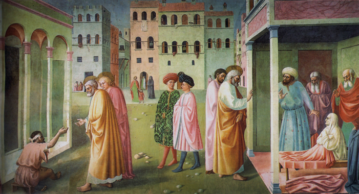 마솔리노는 마사초와 함께 '성령께서 베드로와 요한을 통해 보이신 두 기적, 곧 앉은뱅이를 온전케 하신 일과, 죽은 욥바의 다비다를 다시 살리신 성경 기사'를 벽화로 그렸습니다. 거기에서 1점 투시 구도를 잡은 이가 또한 '마사초'라고 합니다.