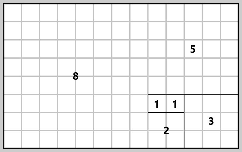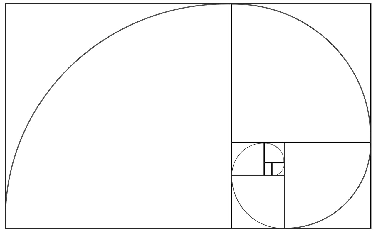 정사각형을 1.618 비율로 축소 반복해서 나선 연결 하면 '황금 직사각형'이 만들어집니다. 칸을 나누어 보면 그 개수에서 피보나치의 수열 '1, 1, 2, 3, 5, 8, 13....'이 있습니다. 즉, 예시에서, '8:5는 1:1.618'입니다. 실제 작업에서, 정사각형의 1.618 비율 축소는 어렵습니다. 그러나 8:5 비율 축소는 어렵지 않습니다.
