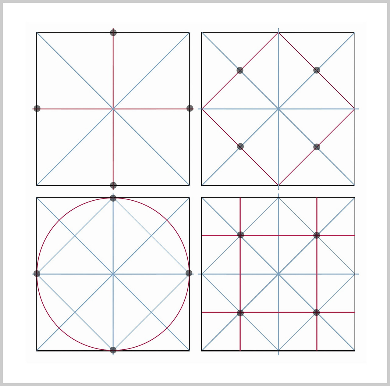예시와 같이, 사각형을 대각선 연결해서 '중심점'을 찾고, 그 중심점을 수직-수평 연결해서 '사각형 테두리 선'의 '중간점'을 찾고, 그 중간점을 다시 대각선 연결해 '마름모'를 만드는 과정이 기본 원리입니다.