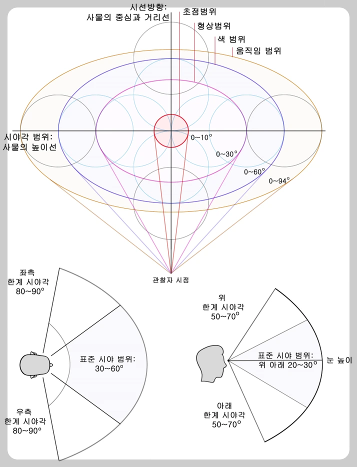 눈은 '시선 방향'을 중심으로 상하 120º 이내, 좌우 180º 이내의 시야각 범위 안에서 '입체와 공간'을 인식하는데, 하나의 초점을 중심으로 둘레를 단계적으로 인식합니다. 좁은 ‘초점범위’ 안에서는 대상의 디테일을 관찰하고, 작은 글씨도 읽을 수 있습니다. 그 범위를 벗어나서 대략 30º 이내 ‘형상범위’ 안에서는 사물의 형상, 색, 움직임까지는 식별하지만, 관찰은 어렵습니다. 그 범위를 넘어, 시야 각 90º 이내 ‘색/움직임 범위’ 안에서는 색과 움직임만 인지할 뿐, 그것이 무엇인지는 짐작만 될 뿐입니다. 곧 사람의 시야각의 90º 넘어는 보는 것이 아니라 인식하는 것입니다.