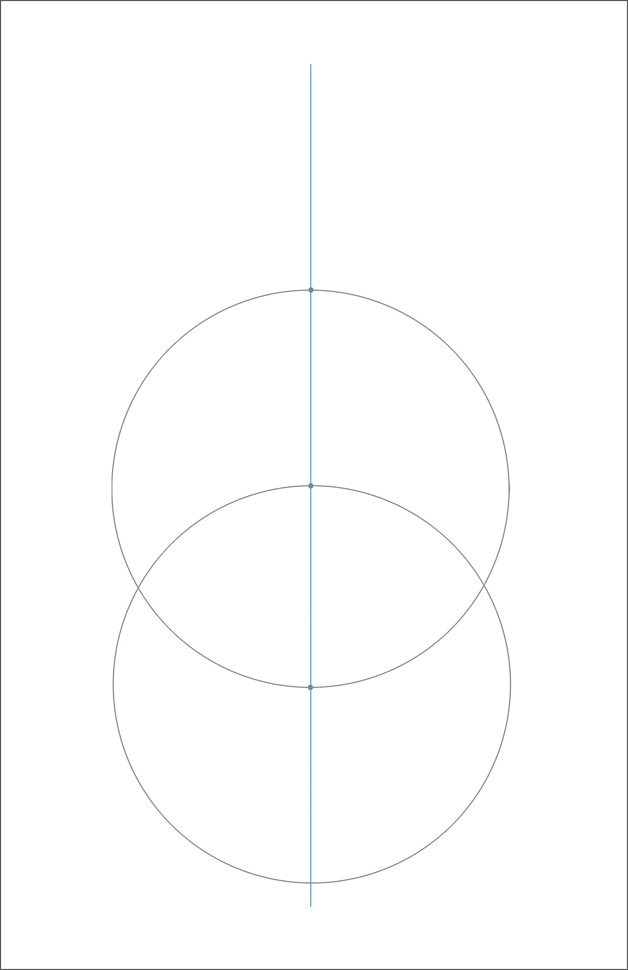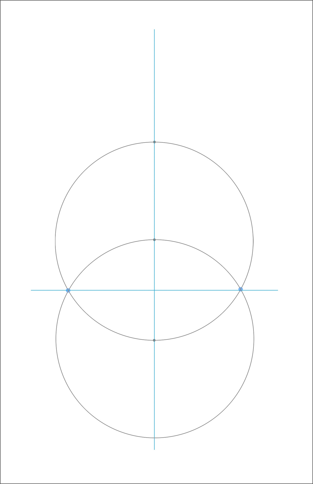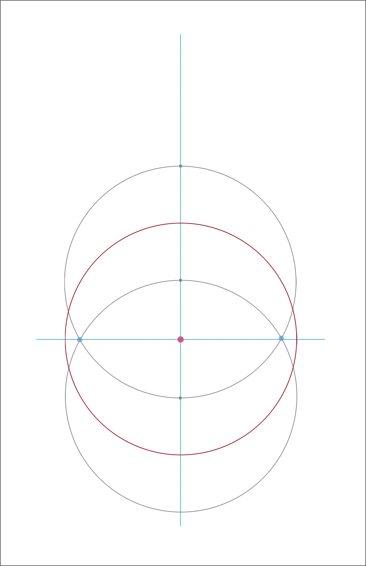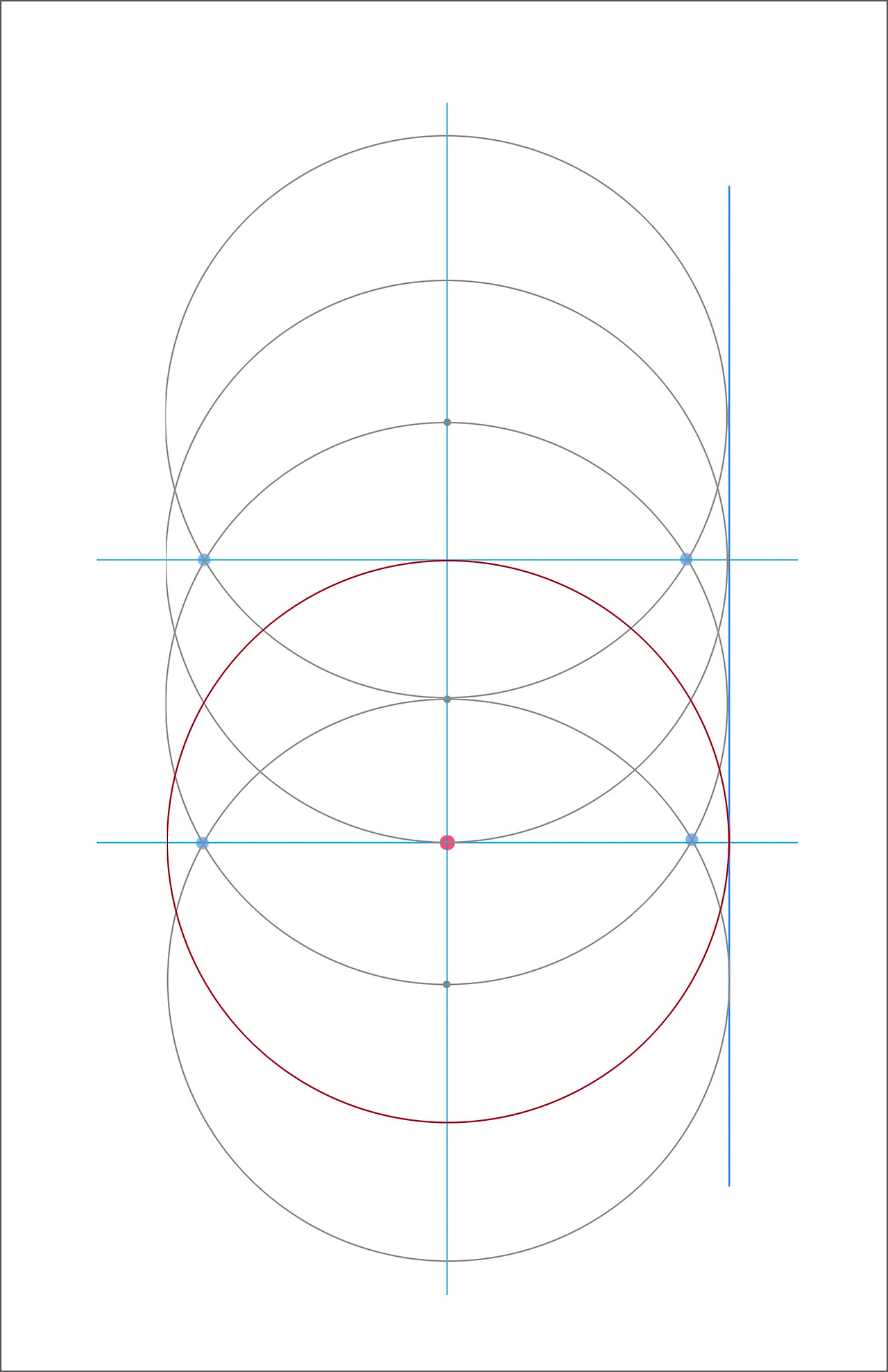 빨간색 원의 정수리와 수직선의 교차점을 중심으로 동일한 크기의 원을 그려주고, 이어서 두 번째 그렸던 원의 정수리의 교차점을 중심 하는 원도 그려줍니다.