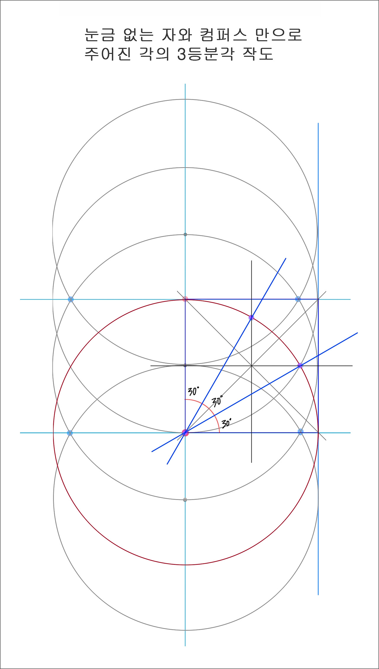 아무튼, 단지 직선과 원 만으로 90도 각을 3개의 30도 각으로 분할하는 것은 어렵지 않게 풀어냈습니다.