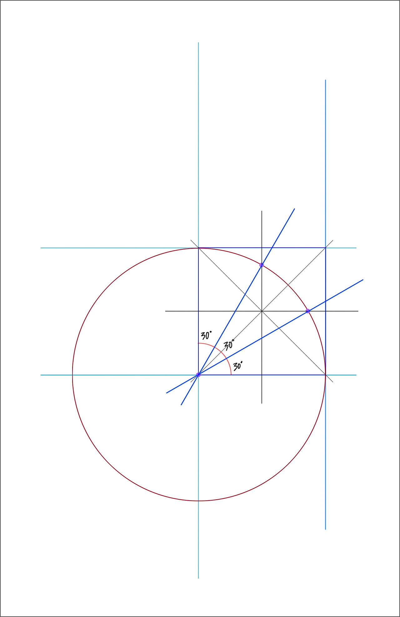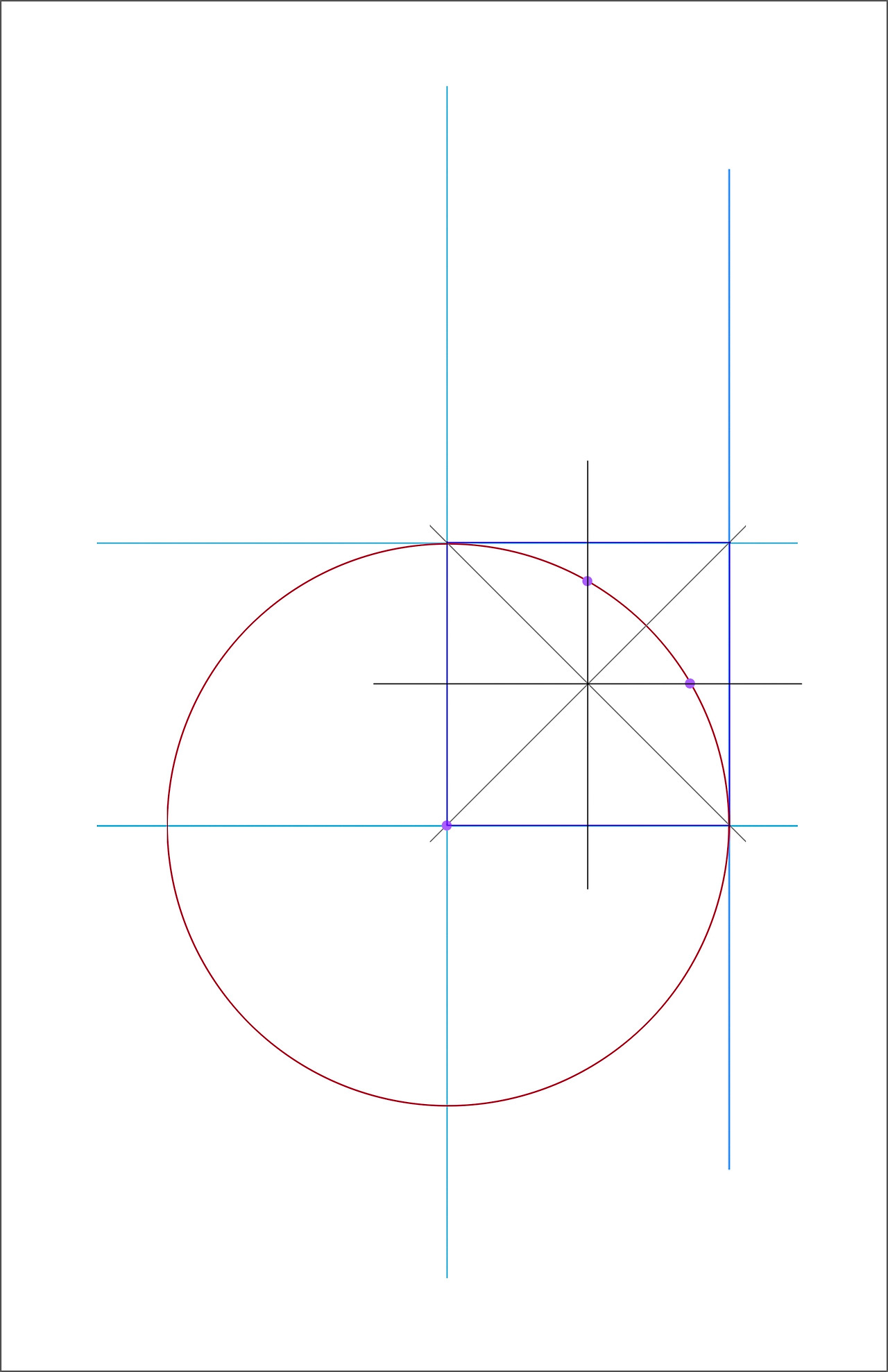 마지막으로 이 과정에서 확인할 것은, '정사각형의 중심점을 잇는 수직선과 수평선'이 '원과 교차하는 점'을 찾는 것입니다.