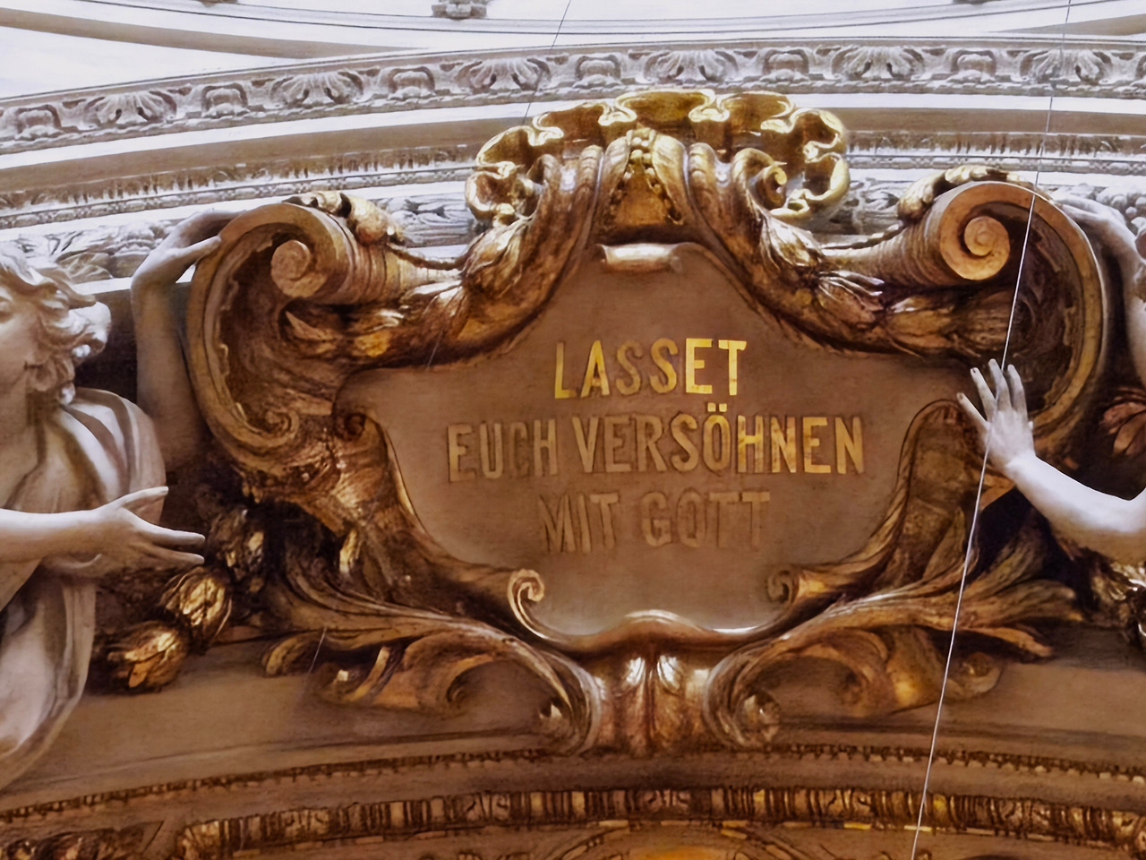 성전으로 들어갔다. 로마의 판테온 신전을 연상케 하는 거대한 천장 돔과 절제된 듯 섬세한 대리석 조각, 붉은 융단이 깔린 계단 위로 펼쳐진 황금빛 제단이 어우러져 바로크 건축의 진수를 보여주고 있었다. 7,269개의 관에서 울려 퍼지는 웅장한 오르간 선율이 무척이나 성스러웠다. 잠시 예배당 의자에 앉아 천장 한 켠의 문구를 바라봤다.