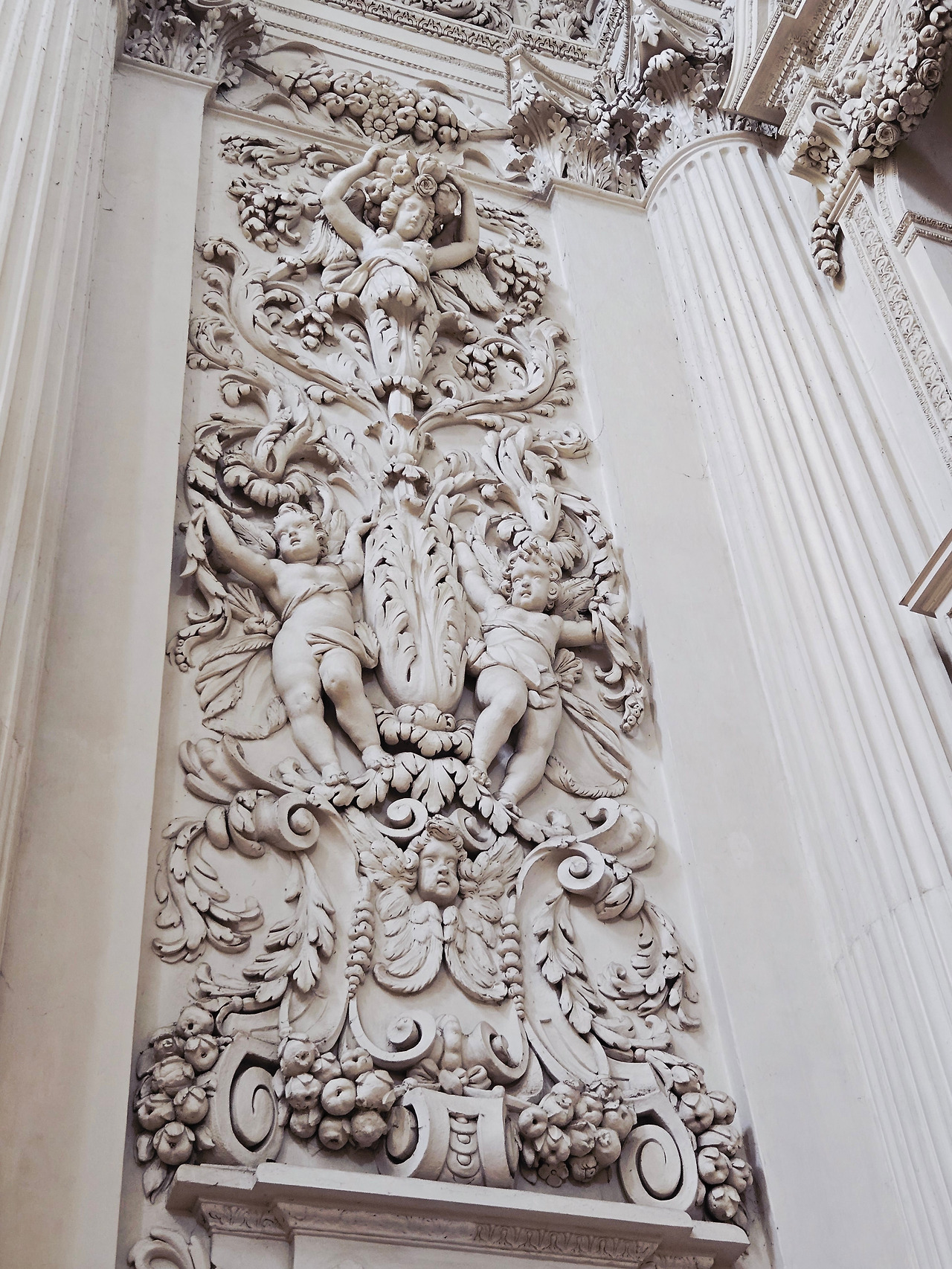 스승과 제자들은 수십 년 동안 매일 조금씩 이 조각들을 만들어 올렸을 것이다. 사다리를 타고, 손에 흰 반죽을 들고, 조심조심 벽에 붙여서 덩굴을 말아 올리고, 천사의 날개를 조심스레 깎았을 것이다. 예술가들의 인내와 땀 그리고 눈물이 숨막히게 비장했다. 위대한 예술 작품은 인간의 한계를 뛰어넘는구나.