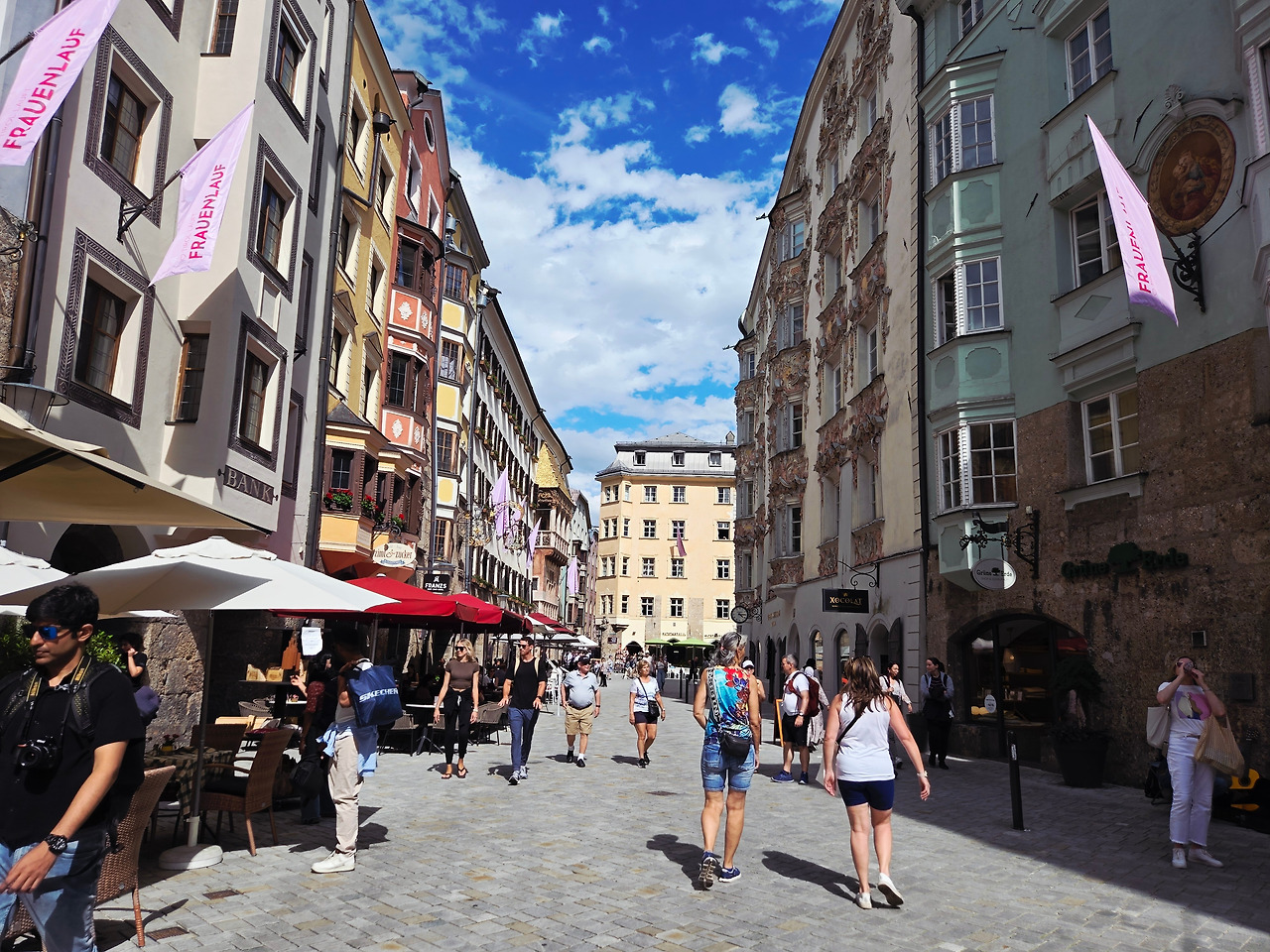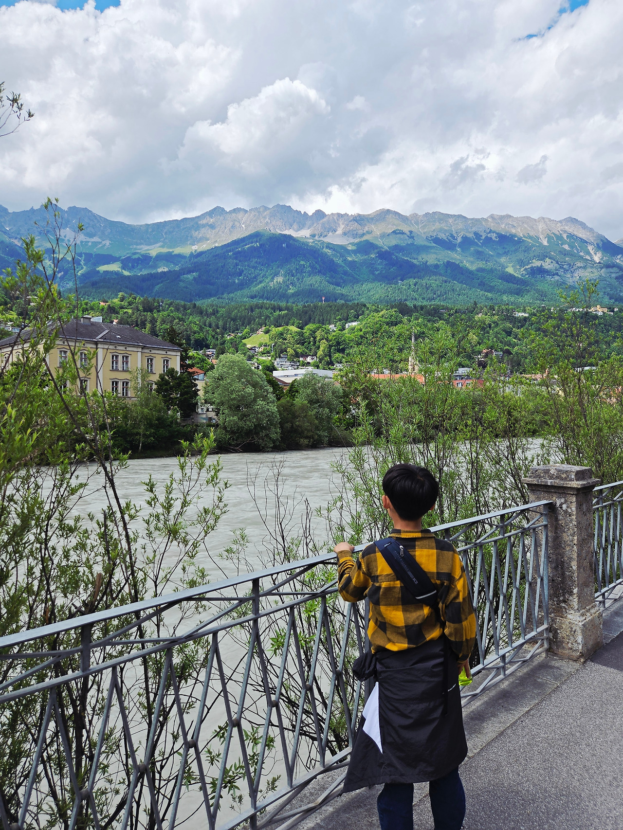노르트케테 정상에서 내려와 시내로 걸음을 옮겼다. 인(Inn) 강변을 따라 흘러내리는 우윳빛 물살은 부드럽게 반짝였고, 강 옆으로 늘어선 세모 지붕의 파스텔 건물들은 마치 동화 속에서 튀어나온 듯 평화롭게 서 있었다. 도시 한가운데서도 고개만 들면 알프스가 눈에 들어왔다. 거대한 능선은 위압이 아닌 위엄으로 사람들을 감싸 안았고, 그 품에 사는 이들은 오래전부터 자연과 함께 겸손하게 사는 법을 배워온 듯 보였다.