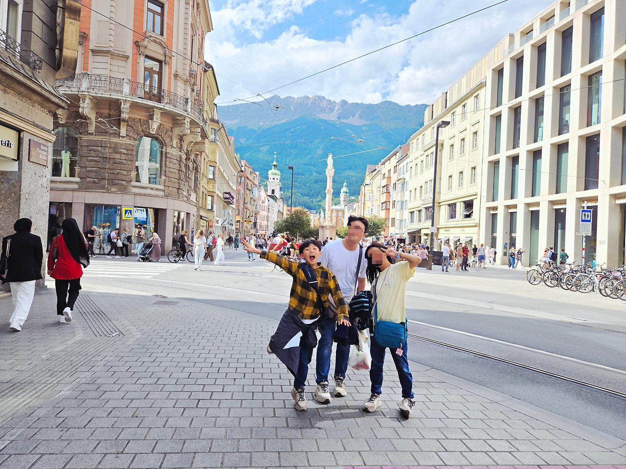 배를 채운 뒤 마리아 테레지아 거리를 따라 천천히 걸었다. 하우프트플라츠 광장은 인스브루크의 심장처럼 상점과 노천카페, 거리 공연이 한데 어우러져 리듬을 타고 있었다. 다솔은 오랫동안 눈여겨보던 모차르트 초콜릿을 손에 들고 행복해했고, 온유는 뚜껑 달린 작은 맥주컵을 기념품으로 거머쥐었다. 맑은 하늘 아래 파스텔빛 건물들은 마치 아이스크림 가게 진열장처럼 눈을 즐겁게 했고, 아이들은 그 앞에서 연신 감탄하며 사진을 찍어댔다.