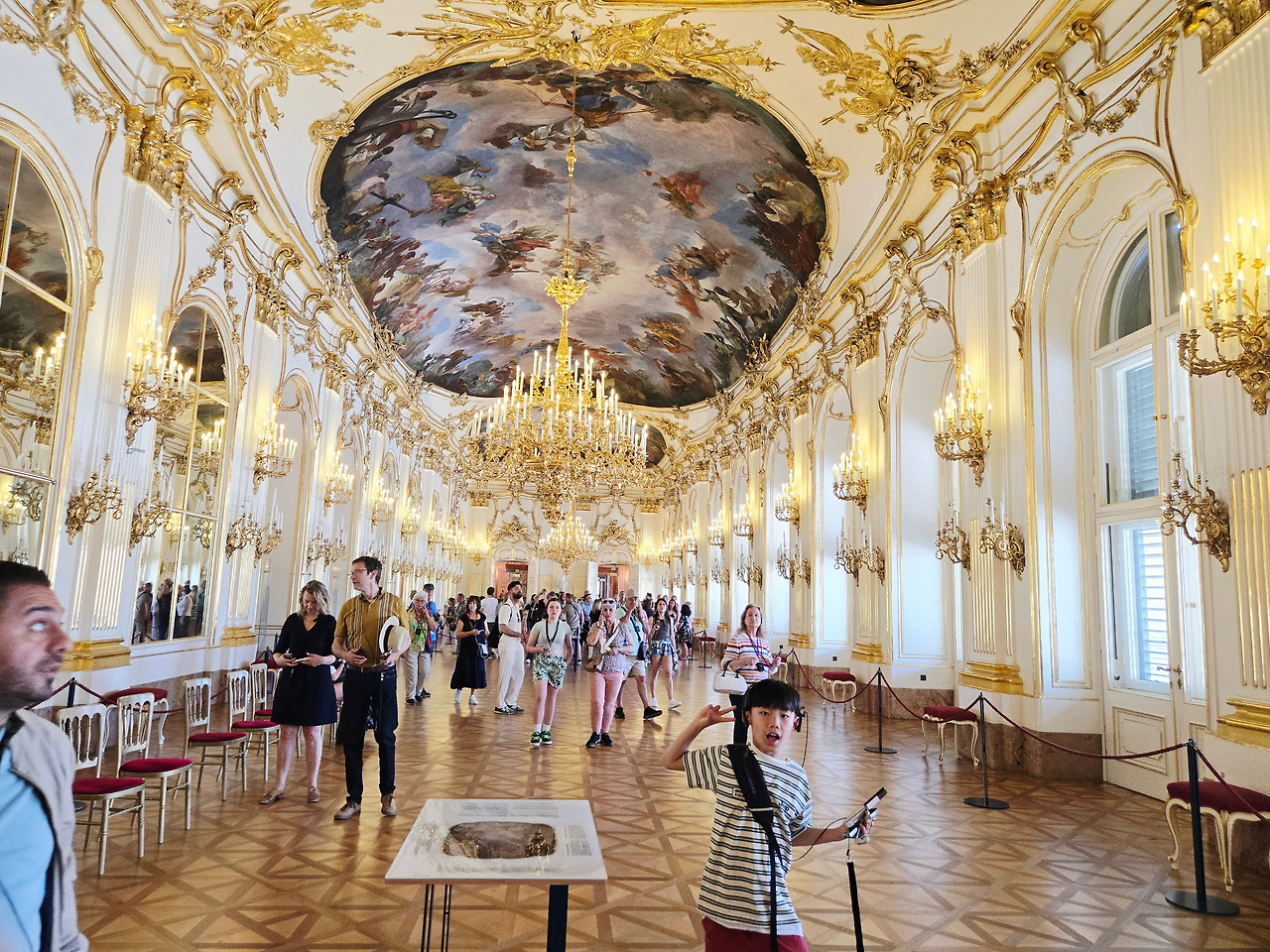 궁전 안 ‘거울의 방’에 들어섰다. 로코코 양식의 이 방은 과도한 화려함 대신 부드럽고 우아한 곡선으로 공간을 감싸고 있었다. 벽면을 가득 채운 대형 거울은 프레임마다 금박 장식이 섬세하게 새겨져 있었고, 거울 사이사이에 하얀 석고 부조가 리듬처럼 배치되어 있었다. 천장에는 은은한 파스텔톤의 프레스코화가 그려져 있었는데, 푸른 하늘과 흰 구름 사이로 천사들이 날아다니는 모습이 마치 천상 세계로 길을 여는 듯했다. 나는 아이들에게 속삭였다.
