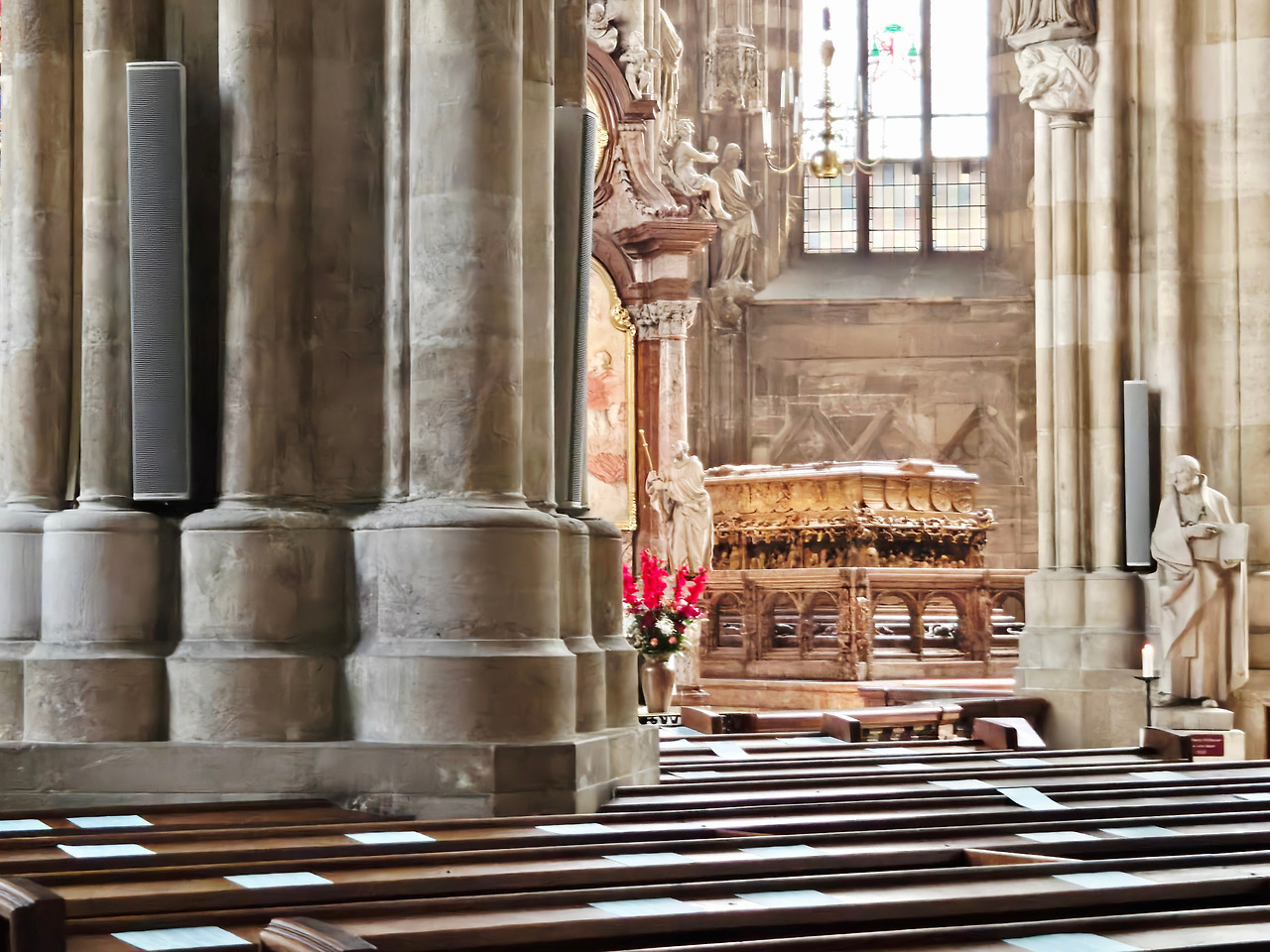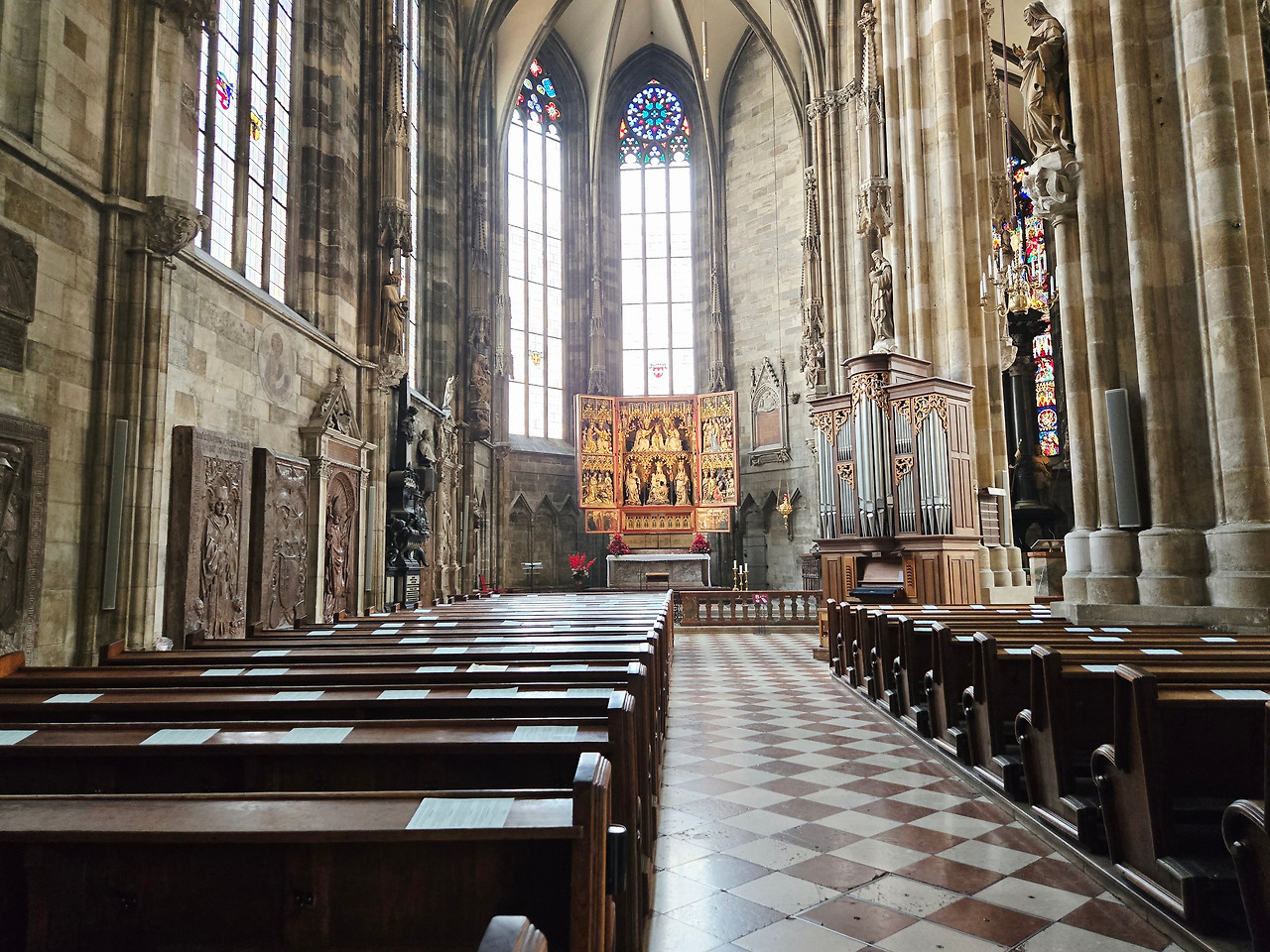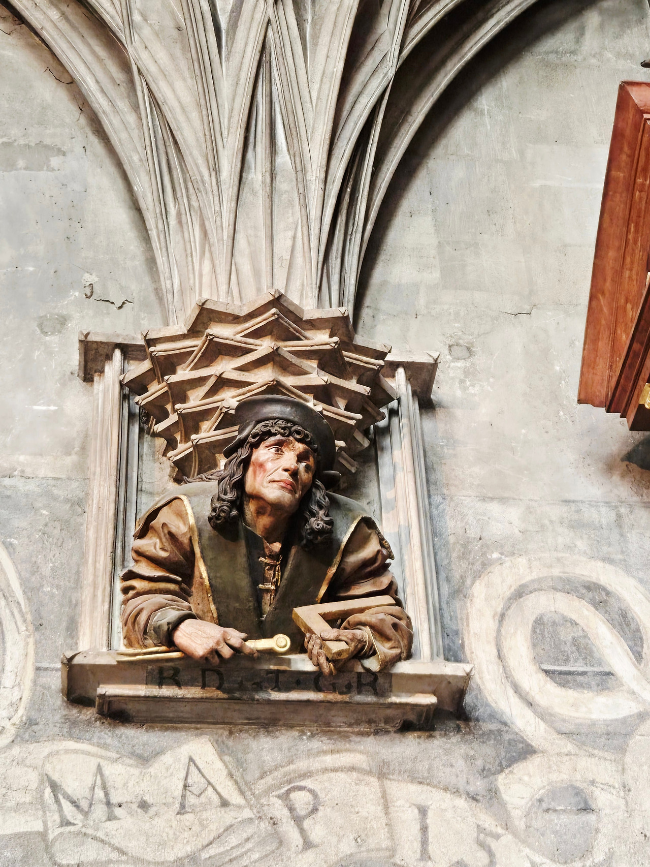 제단 중앙에 초대교회의 첫 순교자인 성 슈테판의 성화가 있었다. 돌팔매질을 받으면서도“주여, 저들의 죄를 용서하소서”라고 기도하던 얼굴이 고요하게 빛났다. 아이들은 왼쪽 기둥에 새겨진 이 성당의 건축가 안톤 필그람의 조각상 앞에서 키득키득 웃었다. 그는 단발머리에 빵 모자를 쓰고, 오른손에는 컴퍼스를 든 채 거대한 오르간 장식을 어깨에 짊어지고 있었다. 장난기 어린 표정과 알록달록한 색감이 숨바꼭질을 하는 어린아이처럼 생동감 있어 보였다.