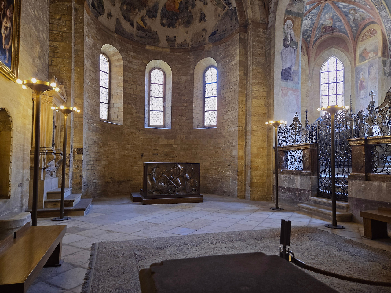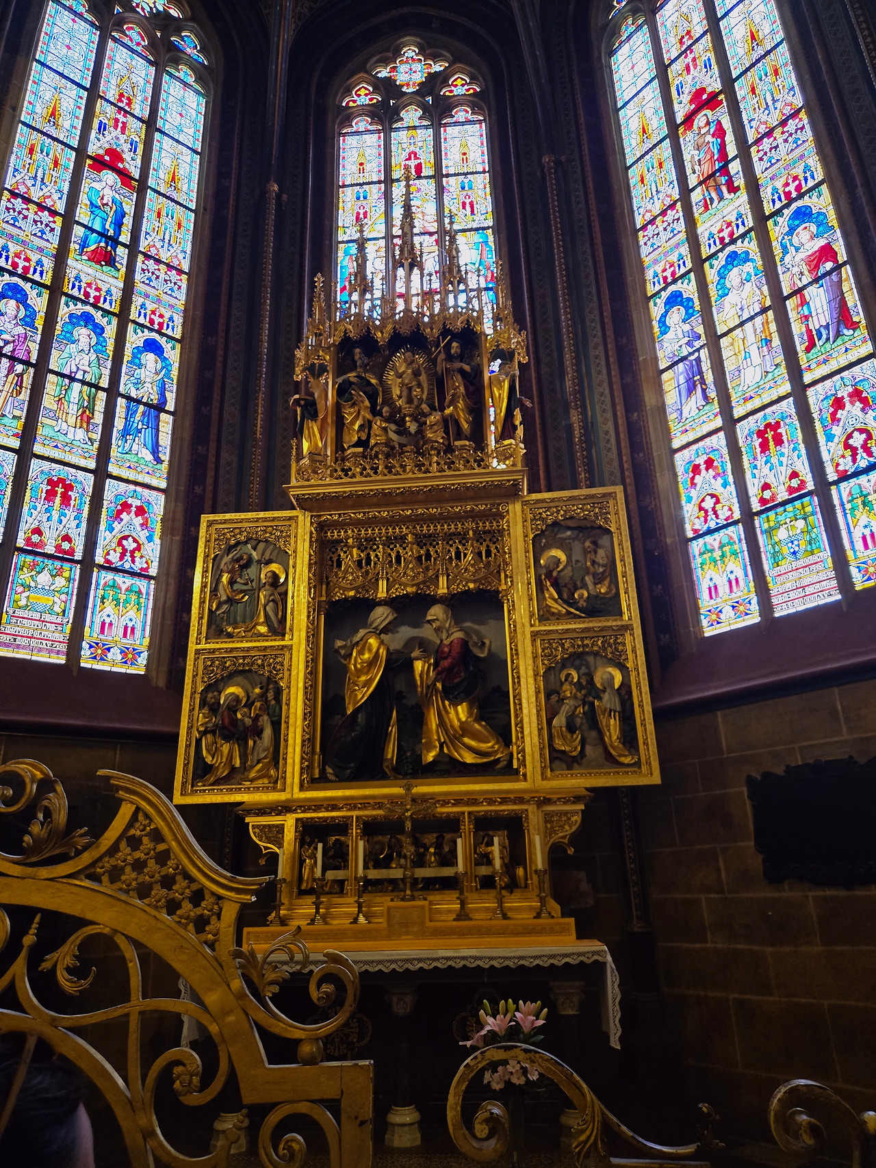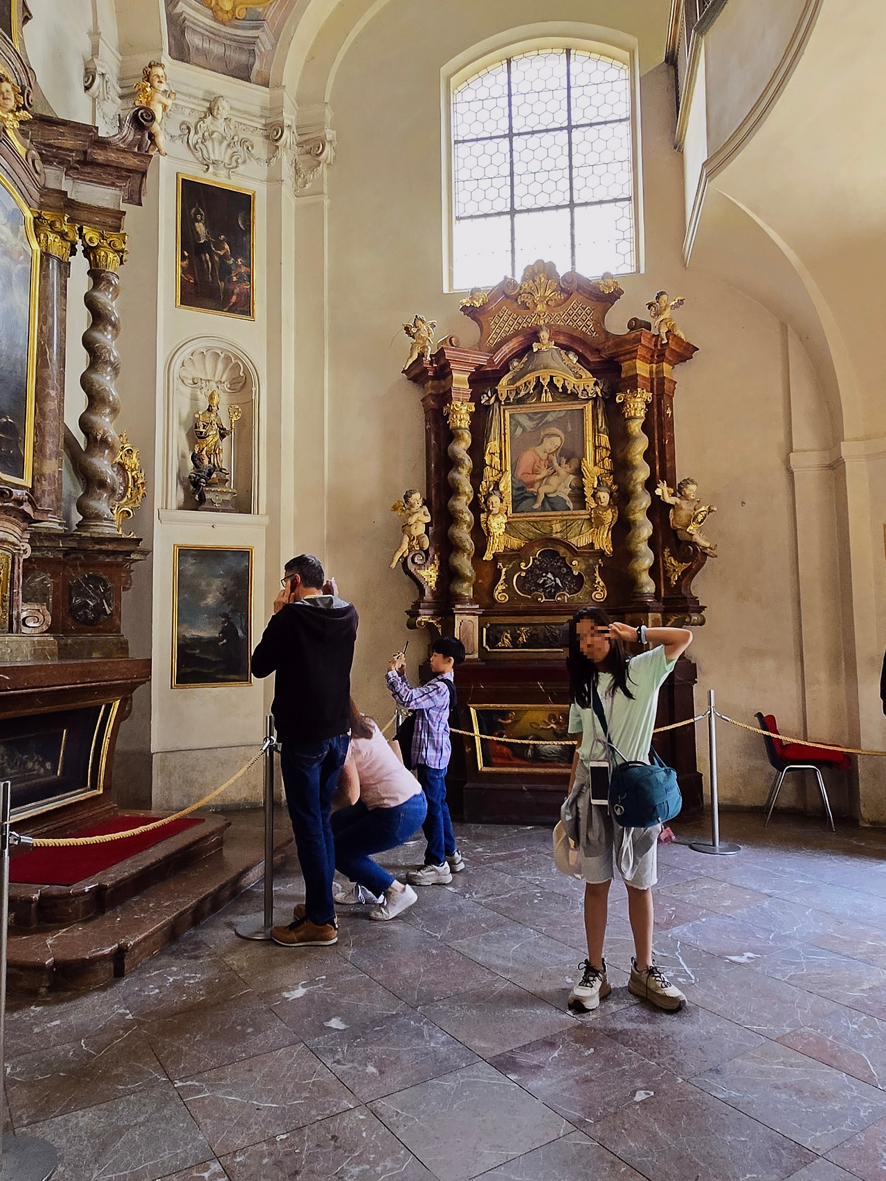대성당 안쪽에는 체코의 수호 성인인 바츨라프의 예배당이 있었다. 황금빛 벽과 1,300개가 넘는 보석으로 장식된 무덤은 눈부셨다. 벽화에는 그의 삶과 순교 장면이 새겨져 있었다. 바츨라프가 동생 볼레슬라프의 칼에 쓰러진 비극적인 순간조차 신앙의 빛으로 기억되었다.