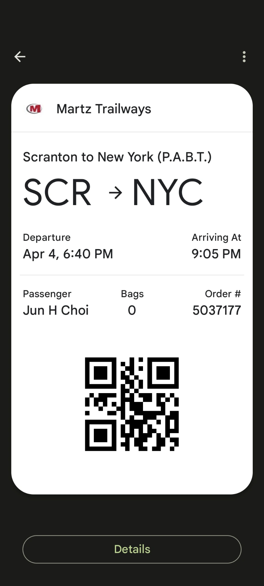가면서 버스표도 예매했다. 저녁에 스크랜튼에서 출발하는 Flix 버스를 예매했는데, 잠시 후 예매가 취소됐다는 이메일이 왔다. 사정을 알아보니 버스 드라이버가 갑자기 아파서 못 온다고 했다. 서둘러 다른 버스 회사를 알아보고 예매했다. 예전에 타고 다니던 Martz 버스다. 가격이 두 배나 비싸지만 찬밥 더운밥 가릴 때가 아니다.
