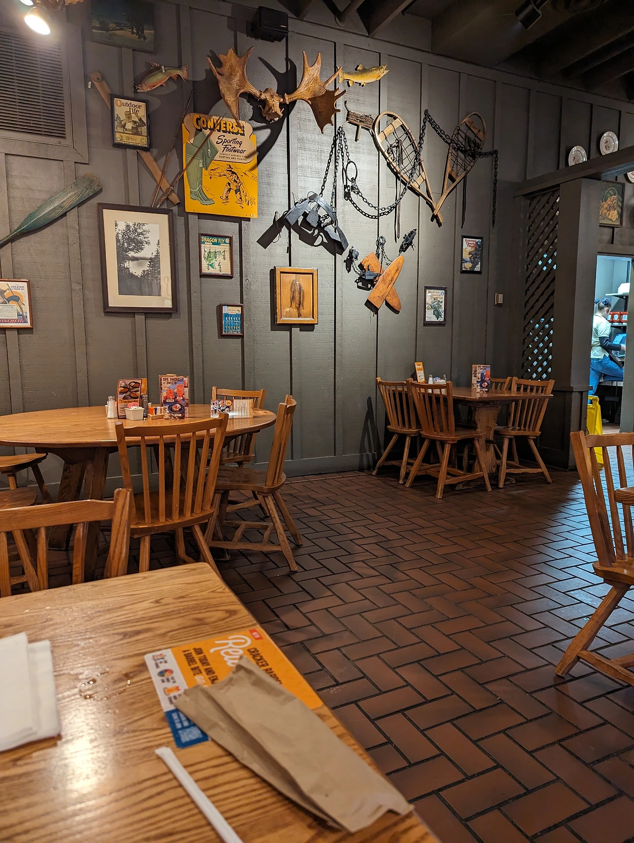 내가 간 곳은 크래커 배럴(Cracker Barrel)이라는 프랜차이즈 식당이다. 그 동안 가보고 싶었는데 기회가 없었다. 이 식당은 미국 전역에서 흔히 볼 수 있지만 대형 트럭 스탑 근처에 위치한 경우가 거의 없기 때문이다. 오늘은 실수로 원래 가려던 큰 트럭스탑이 아닌 동네 작은 트럭스탑에 갔다. 마침 주차 공간도 한 자리 남아서 오늘은 여기서 자고 가기로 했다. 그런데 옆에 크래커 배럴이 있는 게 아닌가.